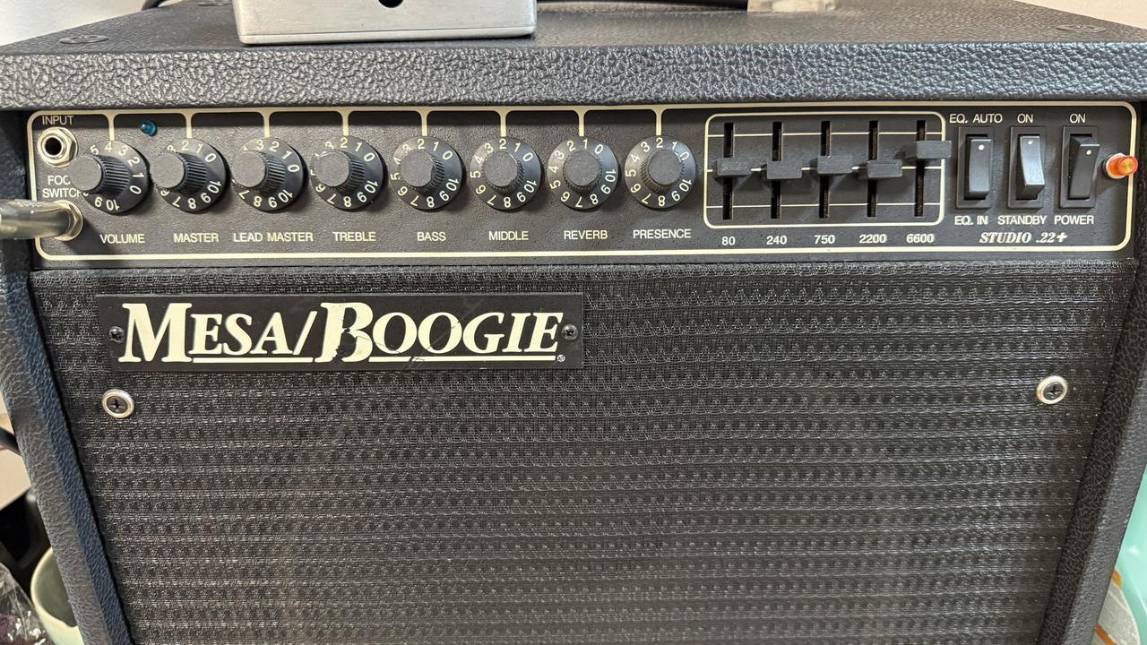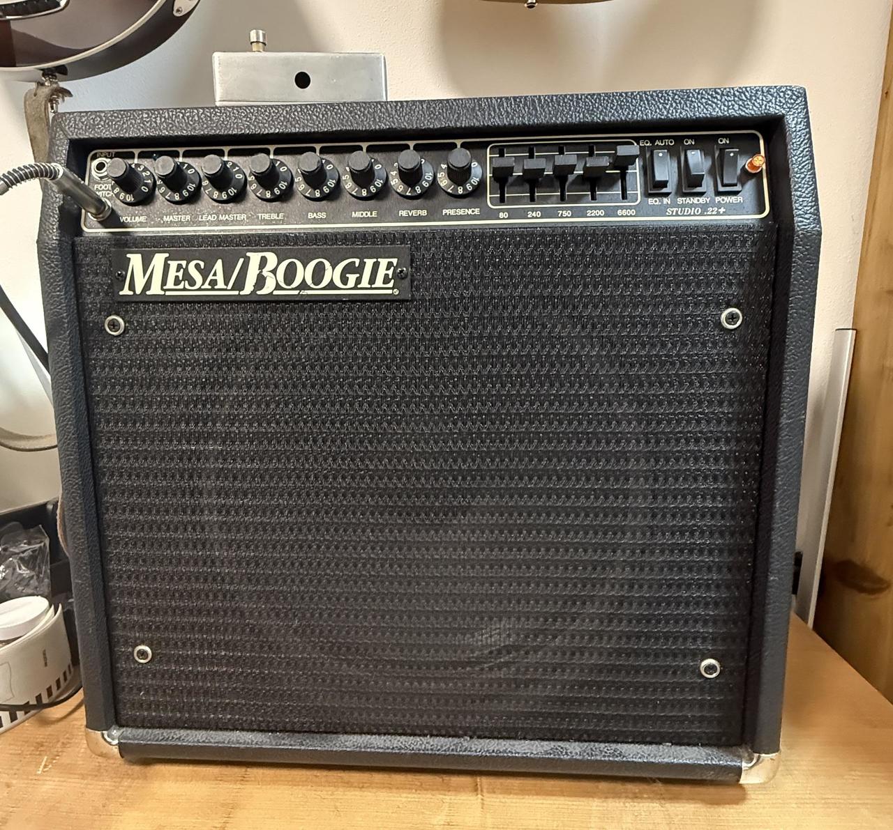 Mesa Boogie Studio 22+ CALIBER SERIES, celolampové, dvoukanálové kytarové kombo z 80. let. Vestavěný grafický ekvalizé. Ekvalizér výrazně rozšiřuje možnosti aparátu oproti verzi bez něj . Kombo je v super stavu, v ceně přepravní case na kolečkách. nožní přepínač, reproduktor Mesa Boogie Black Shadow.