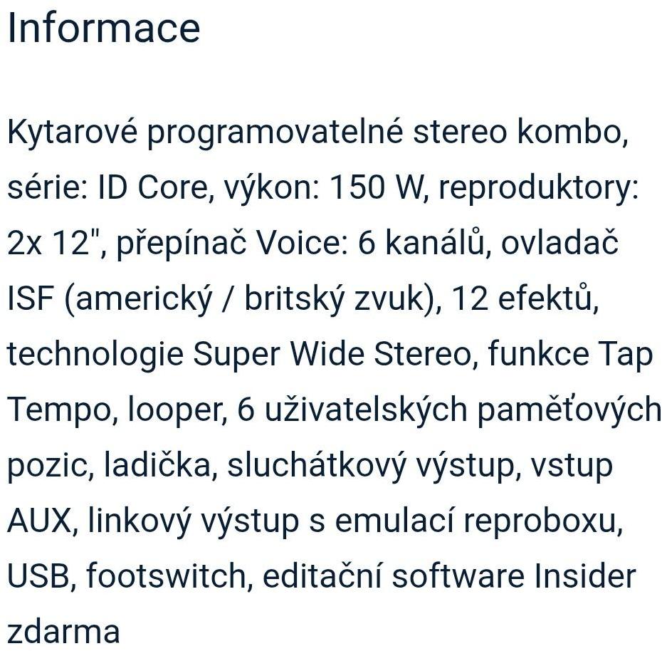 Zdravím,prodám úplně nové jen robalene kytarové kombo nikdy nahrané. Krabice plus papíry ke kombo samozřejmě jsou. Kombo má 2x12repro, 150W - podrobný popis je na fotce, osobní převzetí Brno