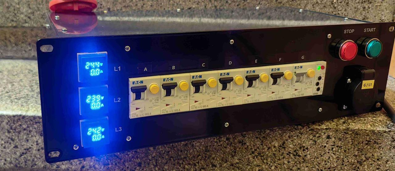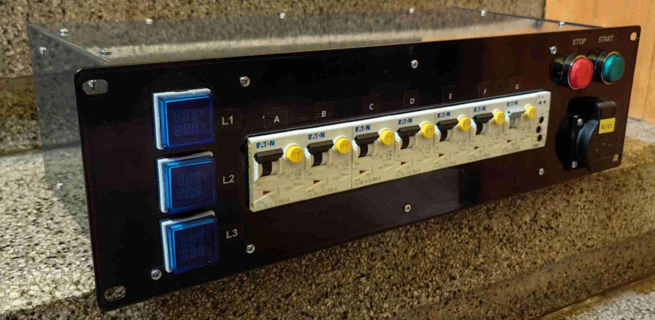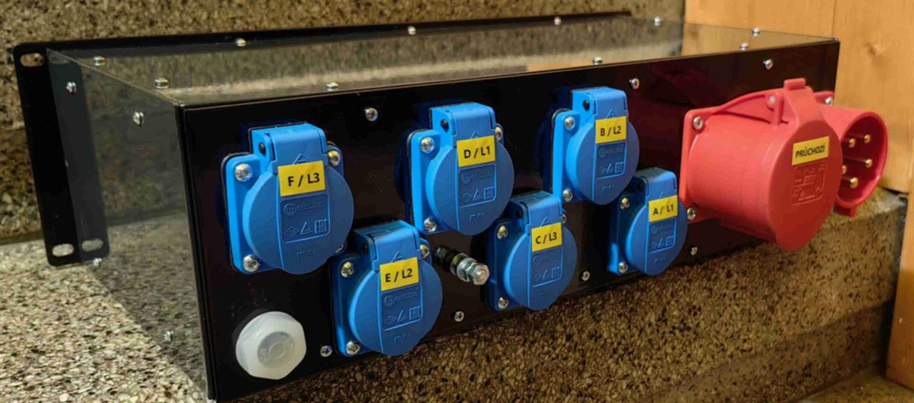 Digitální zobrazení napětí a proudu na každé fázi. Vstup. Zástrčka panelová 3P N PE CEE 32A/400V 50/60Hz / Síť: TN-S / Výstupy: 6 x zásuvka 1P N PE 16A/230V /jištění každá zásuvka samostatně chráničem s nadproudovou ochranou/Jističo chránič/ Typ:PFL6-16/1N/C/003 1 x zásuvka 1P N PE 16A/230V /jištění Chránič s nadproudovou ochranou Typ: PFL7 16/1N/C/003 1 x zásuvka 3P N PE 32A/400V - průchozí Hlídání fazí : Pokles napětí,překročení napětí. Nepřítomnost nulovýho vodiče. Relé HNR-57N +Stykač 32A Rozměr: RACK 3U