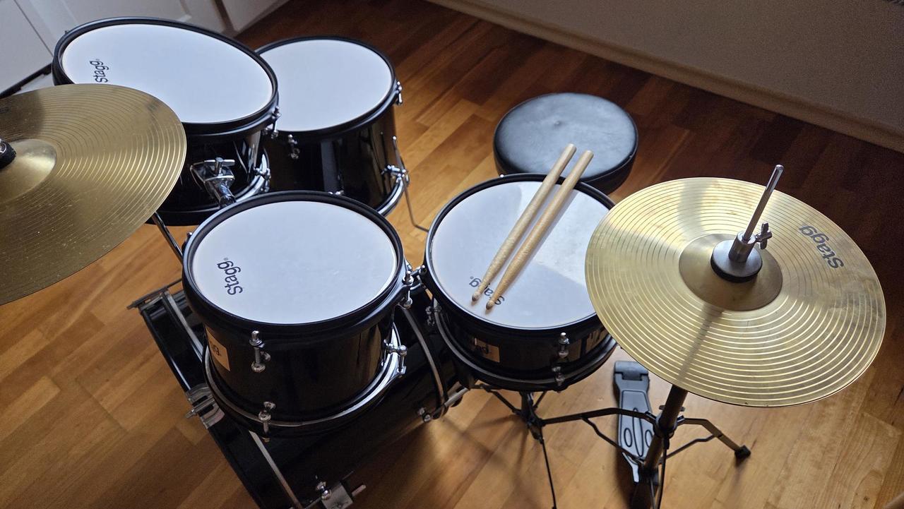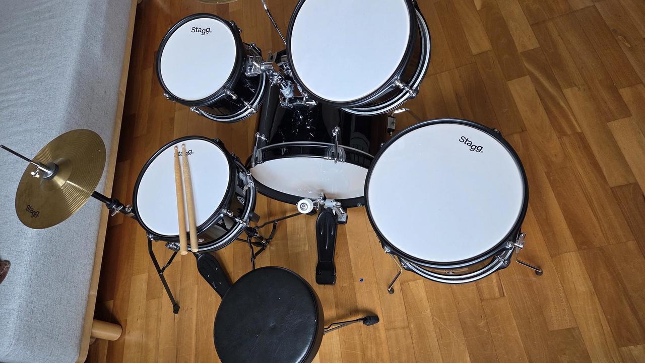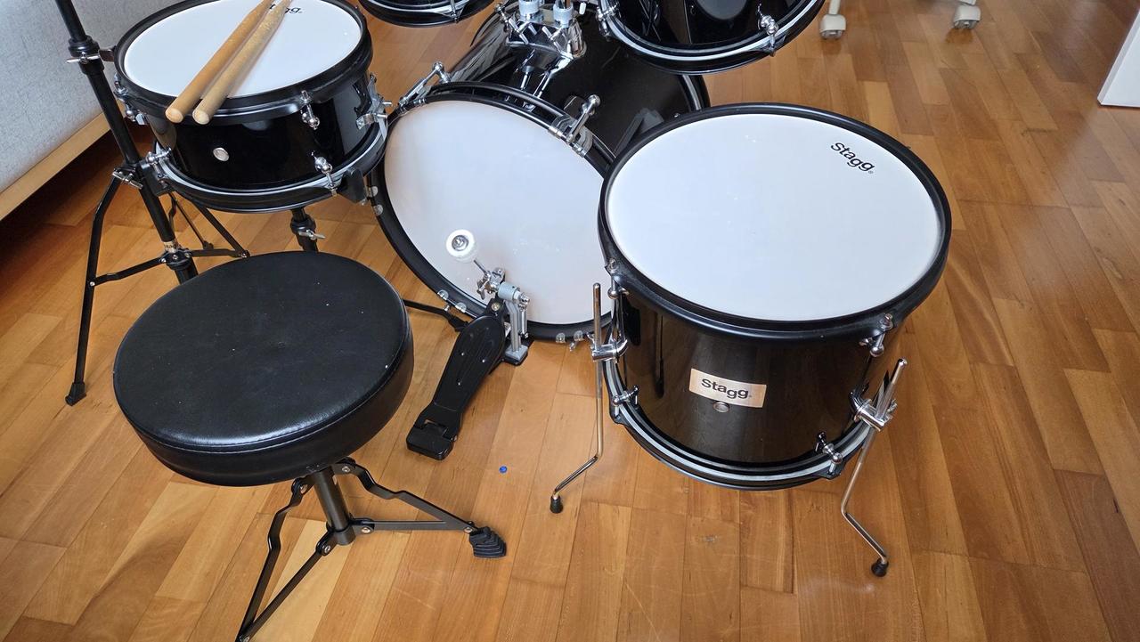 Dětská bicí sada 5-dílná včetně činelů a stoličky. Skládá se z 16" velkého bubnu, 6" a 8" Tomů (přechodů), 10" Floor Tomu (kotel), 10" malého bubnu, 8" Hi-Hat a 10" Crash činelu. Součástí je i stolička, šlapka k bubnu, stojany, pár paliček a ladicí klíč. Barva černá.