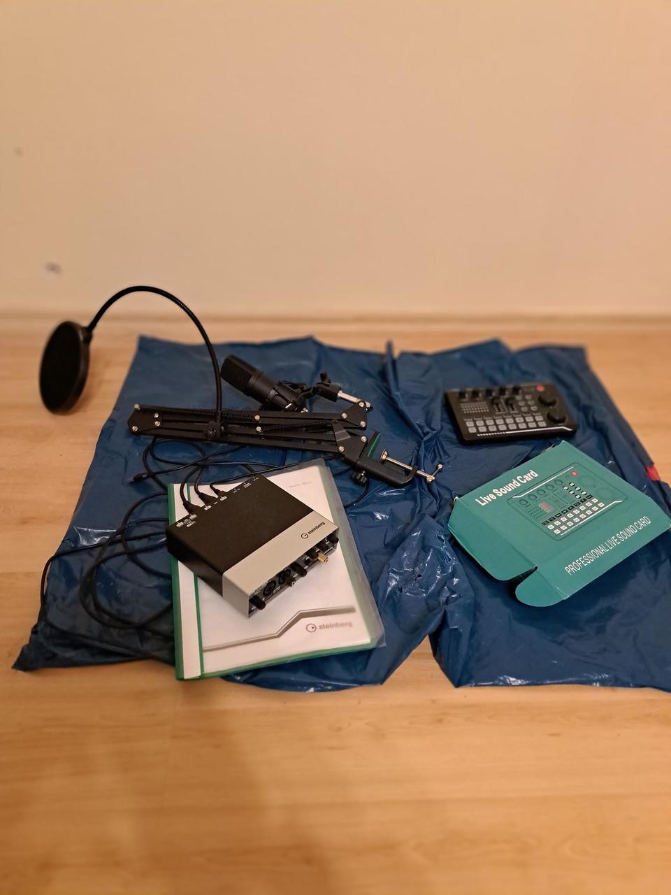 Prodám zvukovou kartu Steinberg UR 22 USB AUDIO INTERFACE (zvukové rozhraní 2x2 USB 2.0 s 2x D-Pre a 192 kHz), mikrofon YOTTO USB (kondenzátorový mikrofon s nastavitelným zavěšením), zvukovou kartu Professional Live Sound Card, spoustu různých kabelů (viz foto), Důvodem je likvidace zkušebny,