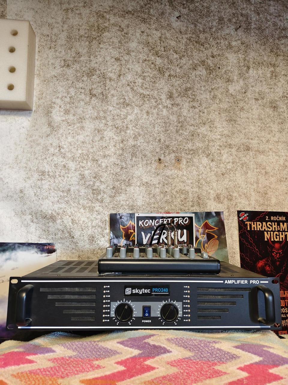Prodám kompletní aparatůru na zpěv nebo na ozvučnění menšího sálu nebo klubu...Koncový zesák Skytec pro 240 + mixážní pult + dvě bedny včetně stojánů a kabelů...Viz fotky