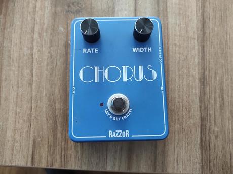 Chorus značky Razzor je krabička určená pro kytaristy, kteří hledají modulační efekt s širokými možnostmi nastavení. Jeho nespornou výhodou je kromě ceny to, že jeho elektronika je zabudována v odolném kovovém šasi. Pokud jde o jeho ovládání, tak to je řešeno pomocí dvojice potenciometrů. Ta nabízí zcela standardní ovladače Rate a Width, kterými se nastavuje rychlost a hloubka modulace. Zbylé prvky jsou na šasi uloženy zcela logicky – vpravo vstup, vlevo výstup, nad vstupem se nachází konektor pro 9V adaptér. Efekt lze napájet i pomocí baterie. Spuštění efektu je signalizováno LED diodou vedle footswitche. Razzor Chorus je velmi dostupný, ale také velmi kvalitní efektový pedál, který ocení nejen začínající kytaristé, ale i pokročilejší hráči, kteří hledají vybavení se skvělým poměrem ceny a kvality.