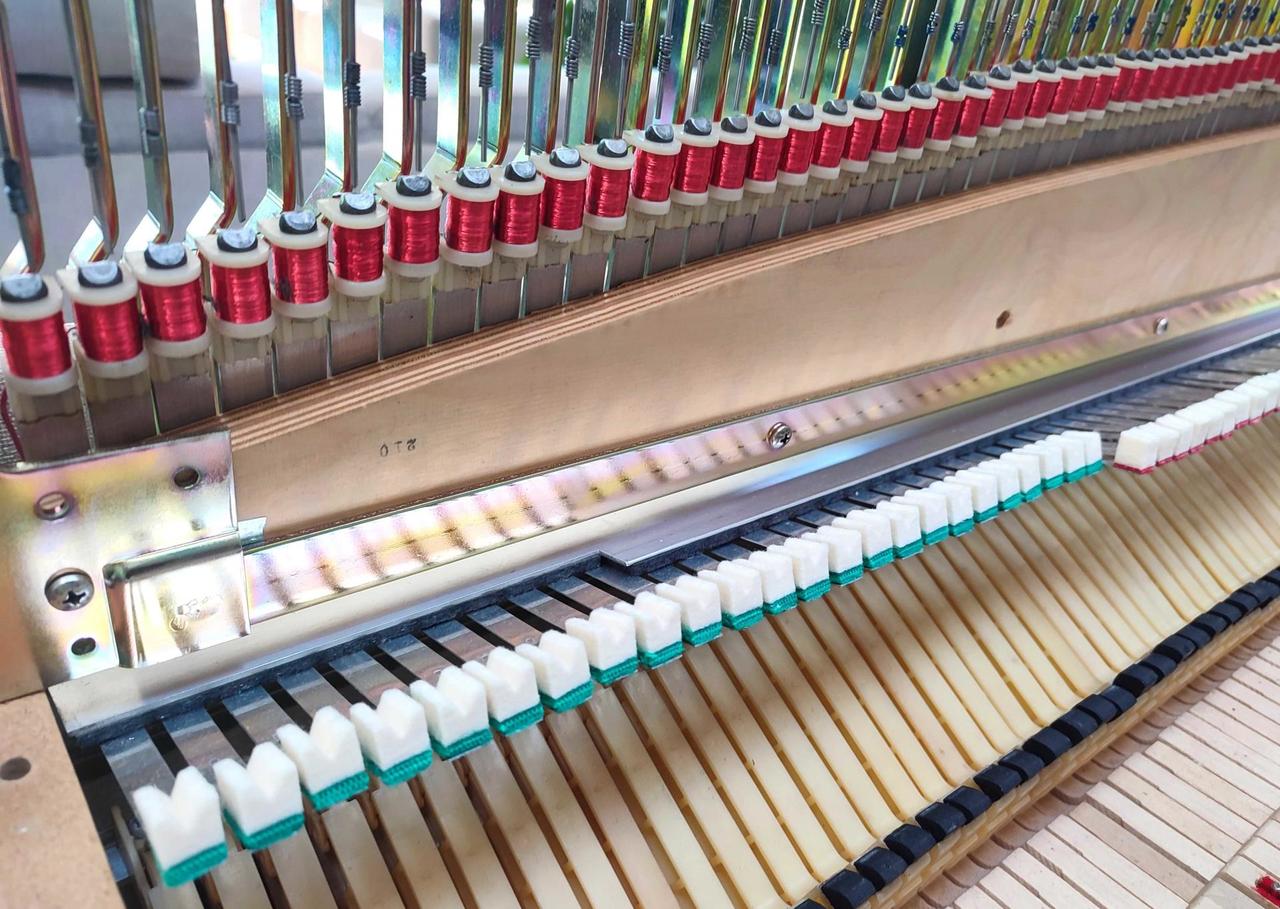 https://www.youtube.com/watch?v=cY2VIJCraEQ Vážnym záujemcom odpoviem na otázky telefonicky. Vyskúšanie Rhodes piana v Bojniciach. Kontakt : 00421 905 854 445 - nová pasívna elektronika od Vintage Vibe USA ( plus pôvodná elektronika ) - nové gumičky na kladivkách / Hammer Tips - Avion Studios USA - vymenené gumičky pod Tonebars / Premium Rubber Grommets - Avion Studios USA - vymenené tlmítka / Premium Damper Felts - Avion Studios USA - nové filce pod klaviatúrou Balance Rail Felds + Front Rail Felds - nový filcový pás pre zadný dopad klávesov Back Rail Felds - nové filce na sustain valčeku - inštalovaný Miracle mod – korigovaný úder kladivka - nastavenie výšky tlmítok - strunky pod Tonebars ošetrené a niektoré vymenené za nové ( bass – mid – treble ) - premerané a testované všetky snímače Pick-up + - 180 Ohm - prečistenie všetkých hrotov na Pick-up a kontaktov na snímačoch - nové chrómovanie - rohy, držiaky, komplet - Hardware kit - vymenená koženka / Tolex - úprava vrchného krytu Rhodes / Top Lid - úprava krajných bočníc klaviatúry – drevená dýha - nadstavené výšky všetkých klávesov - nastavenie zvuku nástroja medzi Tines a Pick-up snímačom - naladenie - a tak ďalej K Rhodes pianu ponúkam za nákupnú cenu čisto nový Preamp s vibrátom Retro Flyer DLX I. https://www.avionstudios.com/rhodes/retroflyer-dlx Cena 4.800 € O CENE SA DÁ JEDNAŤ