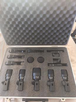 V kufru jsou: 1x kopák KM1200 x kondenzátorové tužky s s windscreenem CM1200 4x dynamické mikrofony na tomy TM1200 Součástí je i kufr a klipy na jednotlivé mikrofony. Preferuji osobní předání v Praze, popř. zaslání na náklady kupujícího.