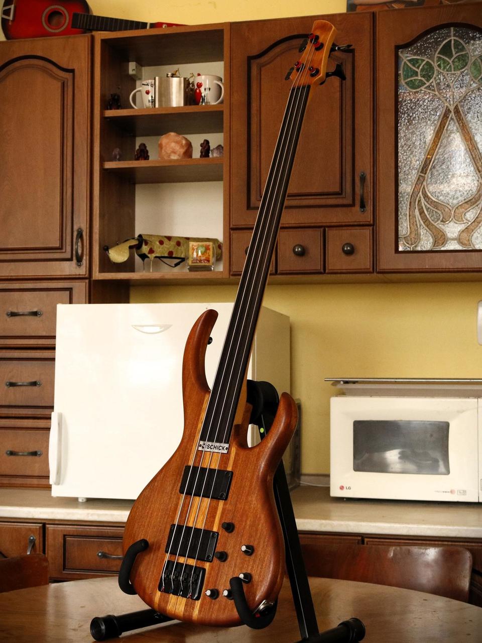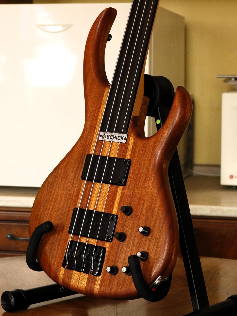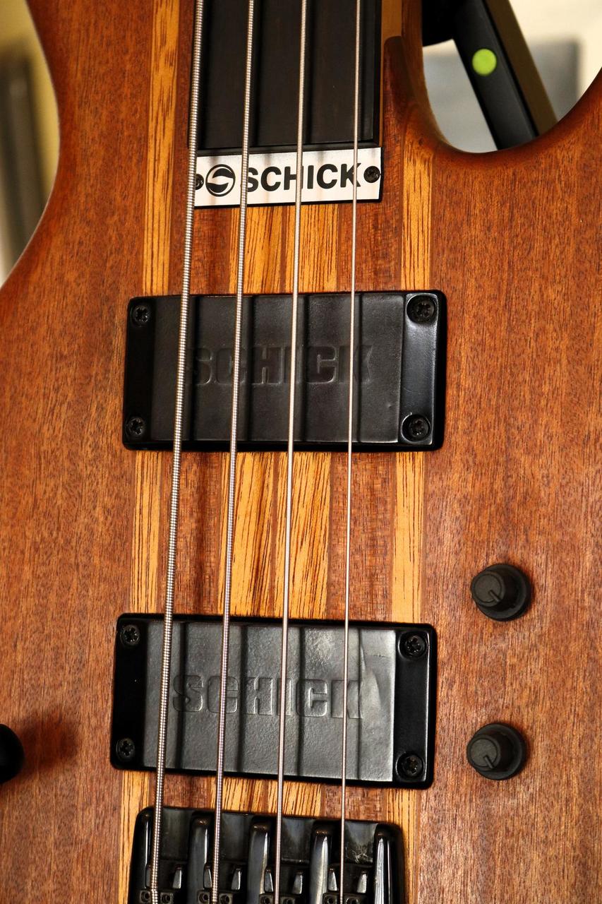 Specifikace: Tělo: mahagon s bubinga topem Krk: javor Hmatník: eben fretless Snímače: Schick humbuckery Elektronika: aktivní, 3pásmový EQ s parametrickými středy Nástroj nabízí široké zvukové možnosti – od jemného, zpěvného fretless tónu až po výrazný, průrazný sound, který se dobře prosadí v kapele. Schick byla menší česká boutique značka z Opavy, založená kolem roku 1999. Zaměřovala se na ručně vyráběné baskytary s originálním designem a důrazem na kvalitní materiály a zpracování. Modely jako Rhino patřily mezi jejich nejvýraznější nástroje a dodnes jsou ceněné pro svůj osobitý charakter a zvuk
