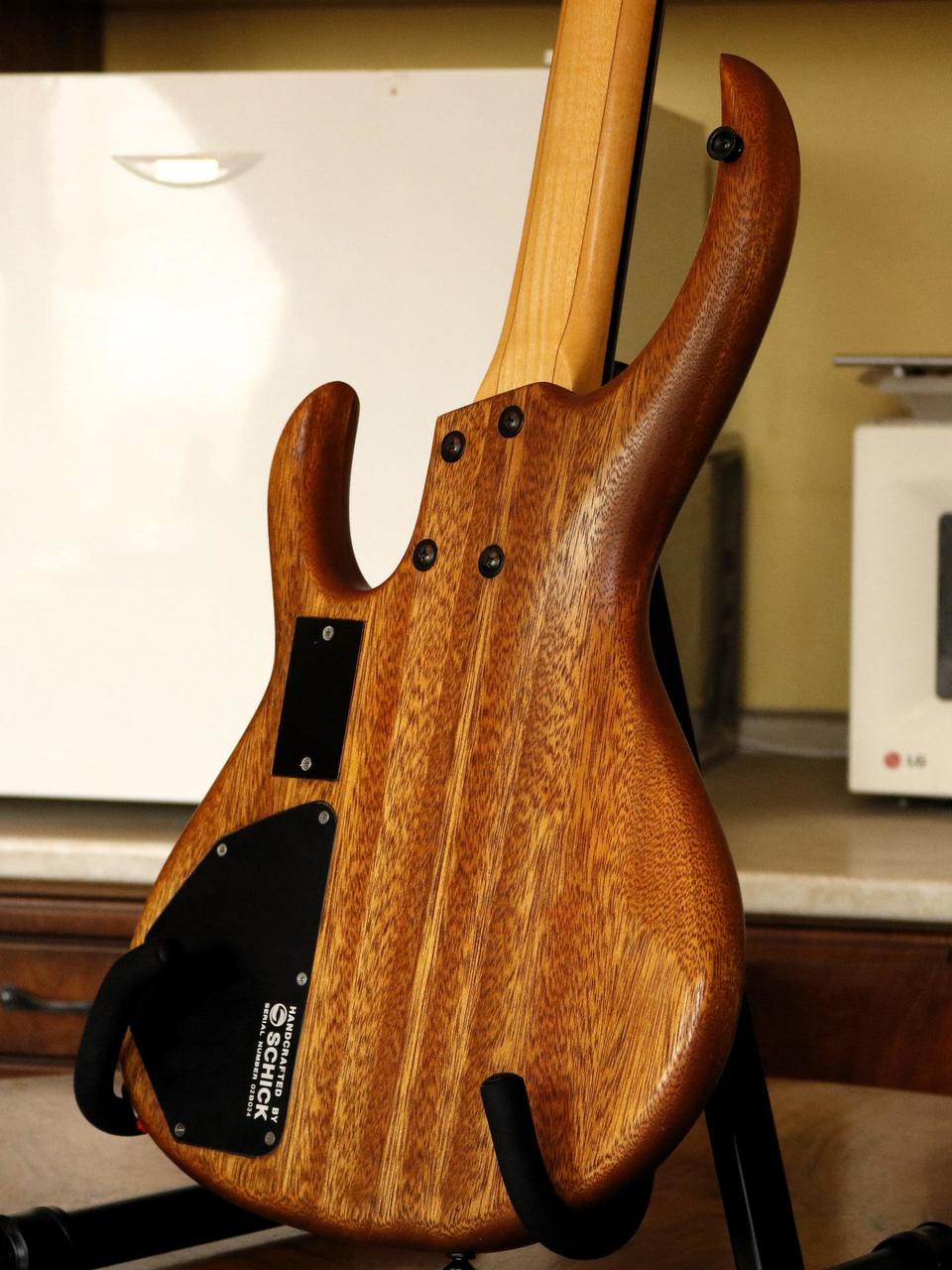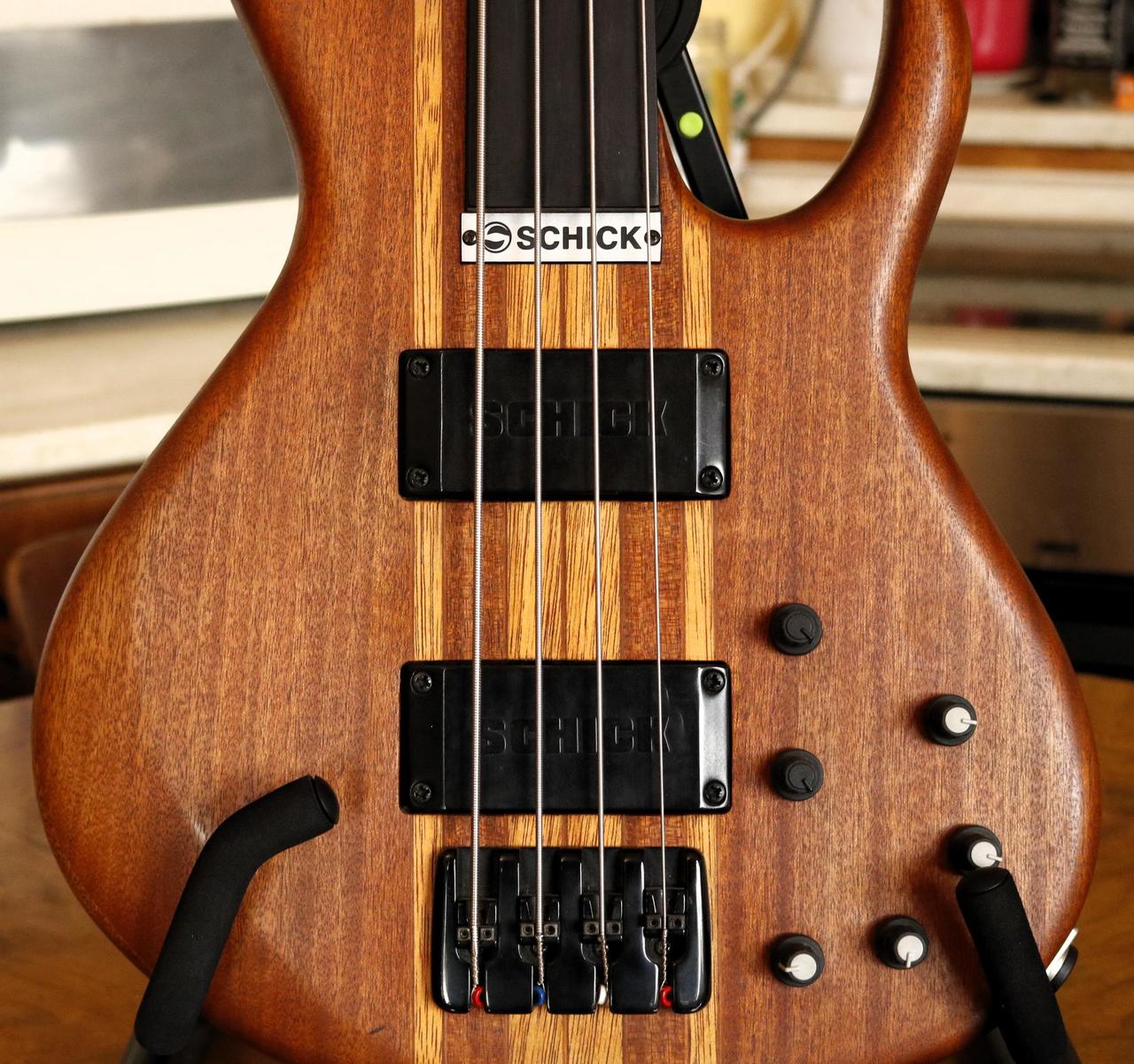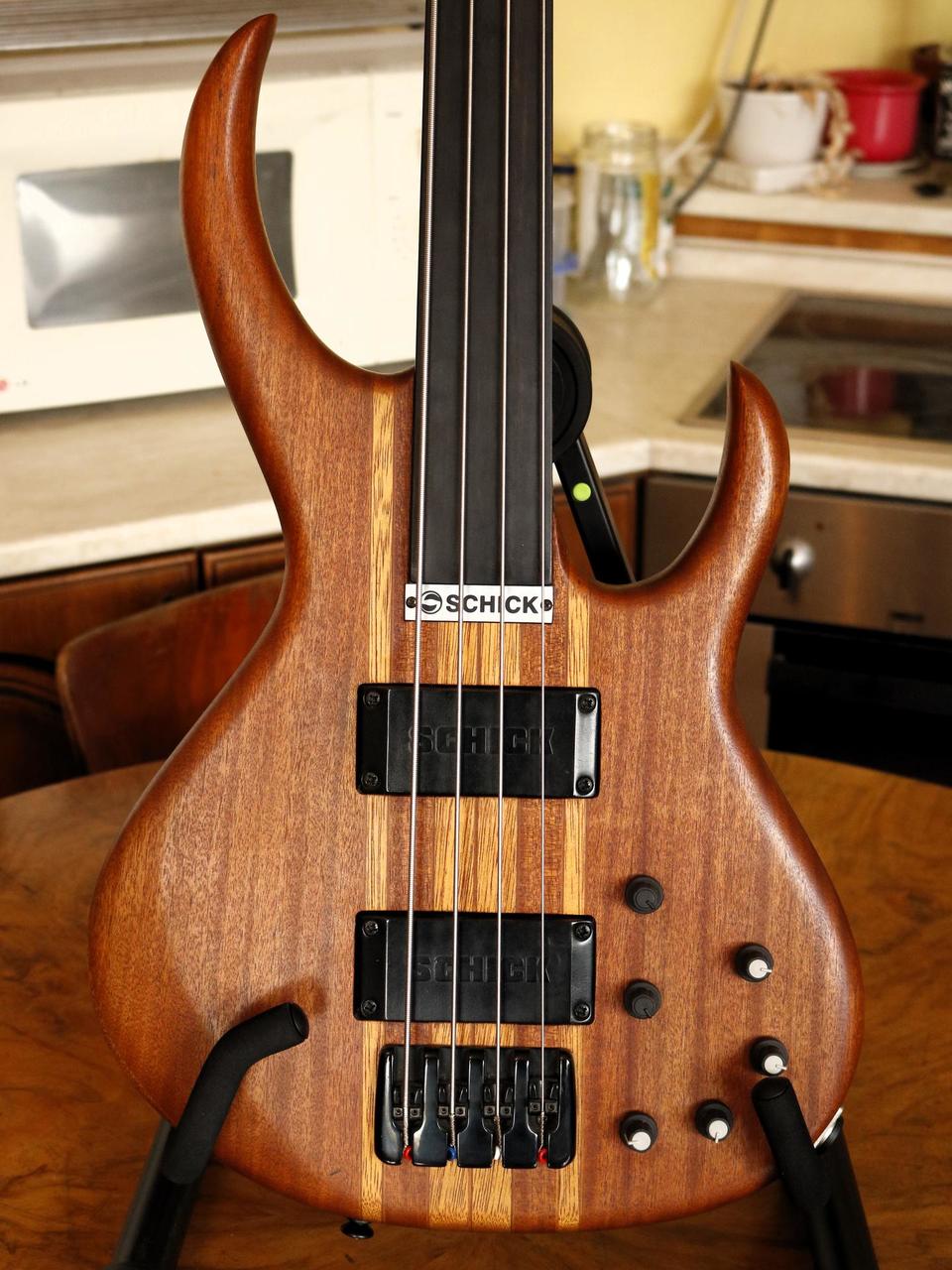 Specifikace: Tělo: mahagon s bubinga topem Krk: javor Hmatník: eben fretless Snímače: Schick humbuckery Elektronika: aktivní, 3pásmový EQ s parametrickými středy Nástroj nabízí široké zvukové možnosti – od jemného, zpěvného fretless tónu až po výrazný, průrazný sound, který se dobře prosadí v kapele. Schick byla menší česká boutique značka z Opavy, založená kolem roku 1999. Zaměřovala se na ručně vyráběné baskytary s originálním designem a důrazem na kvalitní materiály a zpracování. Modely jako Rhino patřily mezi jejich nejvýraznější nástroje a dodnes jsou ceněné pro svůj osobitý charakter a zvuk