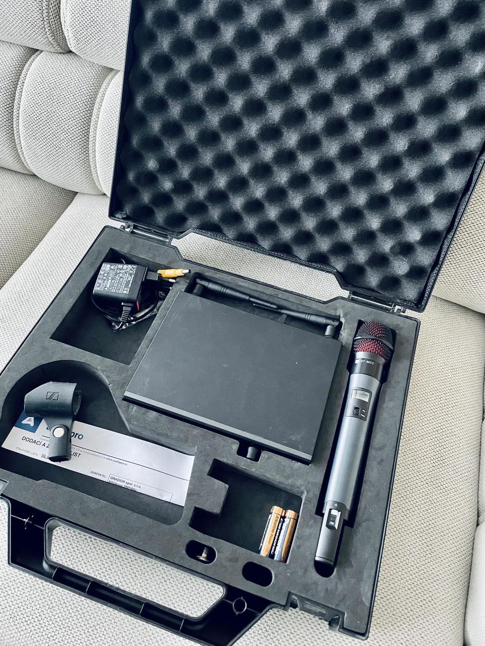 Kompletní bezdrátový mikrofonní systém Sennheiser EWD1 digital s vyměněnou hlavou SE V7 MC2 na přijímači — což je dynamická mikrofonní kapsle vyšší třídy, jež výrazně zlepšuje srozumitelnost a kvalitu signálu. Systém je dodáván s napájecím adaptérem a pevným kufrem na míru pro bezpečné přenášení a skladování.