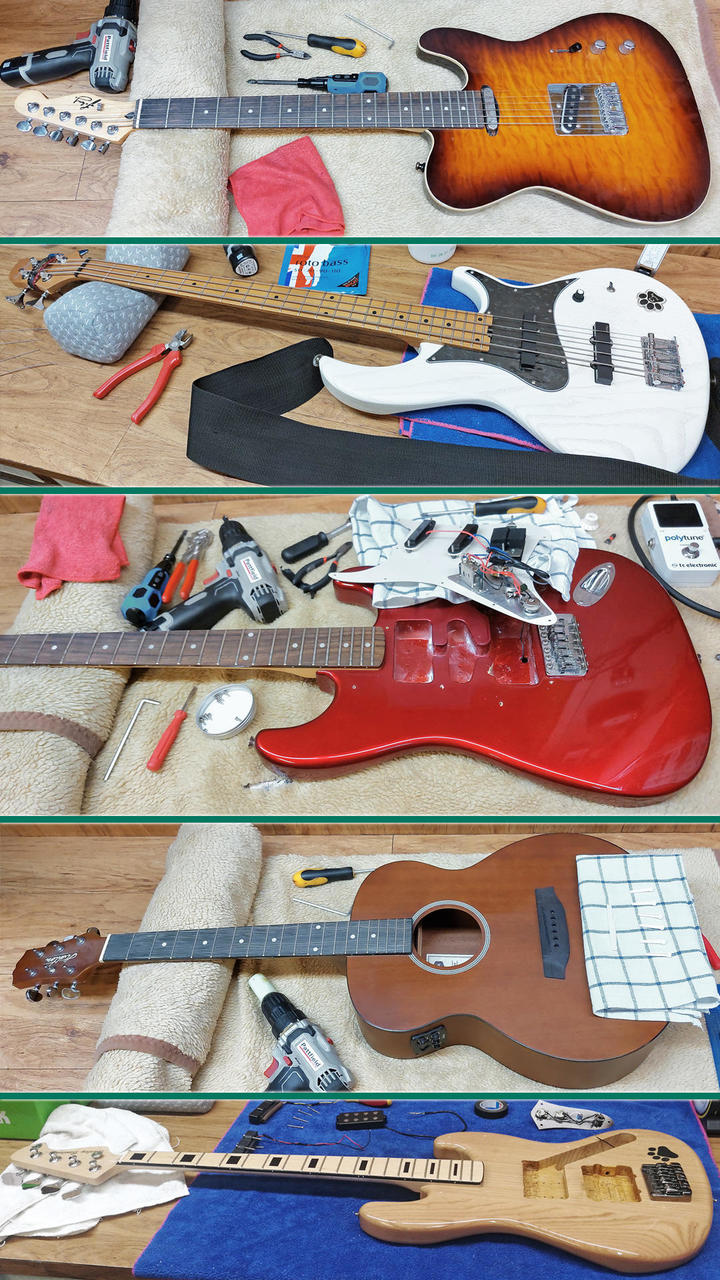 Od výměny strun, nastavení krku, seřízení oktáv přes výměny snímačů včetně elektroniky a hardware až po zabrušování hran pražců, lepení prasklých krků atd. Nabízím osobní přístup k servisu a opravám vašich kytar a baskytar, elektrických i akustických. 16 let zkušeností. Lokalita Městec Králové.