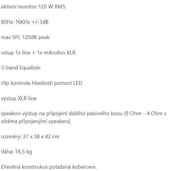 je Aktiv + pasiv monitory 12“ - monitor The Box MA-120MKII – aktivní – zesilovač 2 kanály – mono vstup a možnost připojit druhý box - pasivní je k tomu typ Talmus XT 120M. Síťový, XLR a reproduktorový kabel k tomu. Jen osobní odběr, možno předvést na místě ve zkušebně Konec projektu. Cena je komplet