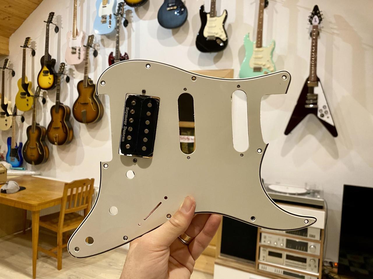 Pickguard (vintage bílá) pro stratocaster v kombinaci H-S-S (pokosený humbucker) osazený Seymour Duncan SH-4 stejně jako má Billie Joe Armstrong na svém stratocasteru.