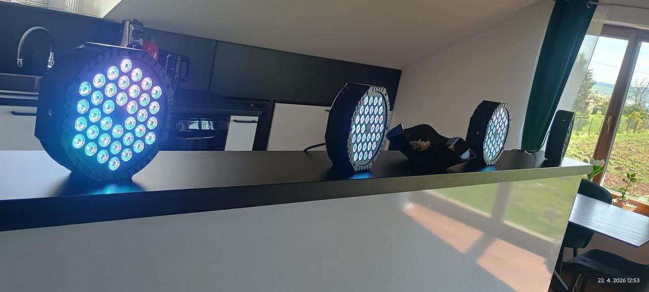 Zcela nové. Za ty peníze jsou fakt parádní. Foceno záměrně z boku. Dohromady 9 režimů, dálkový ovladač a možnost DMX připojení. Pro mě nevyužití, dostal jsem je.