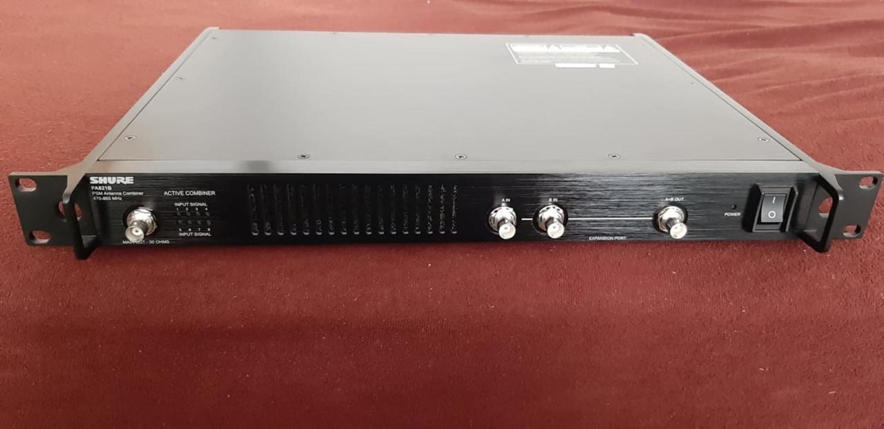 SHURE PA821B-E ( 470-865 MHz) - je širokopásmový anténní slučovač, který umožňuje použití jedné společné antény až pro osm bezdrátových vysílačů. V 100% kondici. Instalované pouze v racku.