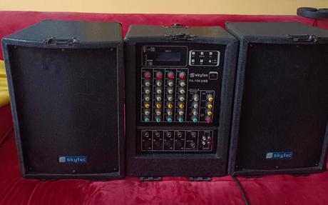 Mobilní aktivní zvukový systém s USB portem a slotem na SD/MMC karty pro přehrávání audio soborů. Výkon 2x 75W RMS, sytém se skládá z 4-kanálového mixážního pultu se zabudovaným zesilovačem a dvojice 2-pásmových reproboxů. U každého vstupního kanálu lze regulovat výstupní hlasitost (Vol), vyvážení levého a pravého kanálu (Pan), upravovat zvuk zkreslením vstupního signálu (Eff), regulovat korekce (3-pásmový EQ) a úroveň vstupního signálu (Gain). Připojení mikrofonů pomocí XLR konektorů, linkové vstupy Jack 6,3 u každého kanálu, RCA out/in pro připojení externích audio zařízení. Zvukový efekt Echo s možností nastavení parametrů Delay, Level and Depth. Reproboxy jsou osazeny 8" basovým reproduktorem a 7x3" piezo tweeterem, připojení pomocí konektorů Jack 6,3. Satelity jsou vybaveny hnízdem pro stativ, celý systém má ochrannou povrchovou úpravu, kovové rohy a mřížku reproduktorů. Snadné složení systému do kompaktní sestavy určené pro transport, praktická kolečka, teleskopické madlo a vnitřní úložný prostor pro kabeláž, mikrofony a další příslušenství. Ideální mobilní zvuk pro taneční a sportovní instruktory, prezentace, workshopy a PA aplikace v malých prostorách. Napájení 230V AC, 50 Hz Frekvenční rozsah 20 Hz - 20 kHz (3 dB) Výstupní výkon 2x 75W RMS S/N ratio 86 dB THD <0,05% Rozměry zesilovače 400 x 285 x 210 mm Rozměry reproboxů 400 x 280 x 260 mm Rozměry střední část 400 x 285 x 115 mm Hmotnost zesilovače 10,6 kg Hmotnost reproboxu 7,3 kg Velikost balení 40 x 28.5 x 26.5 cm Hmotnost balení 10 kg