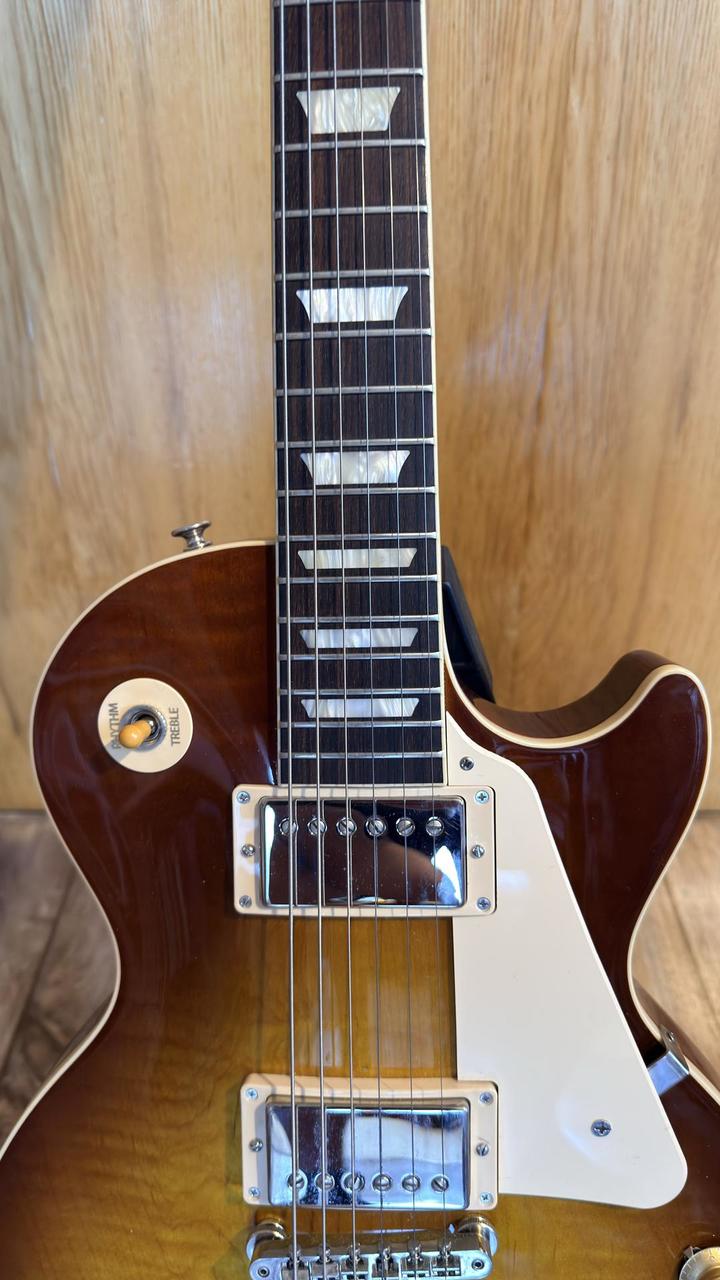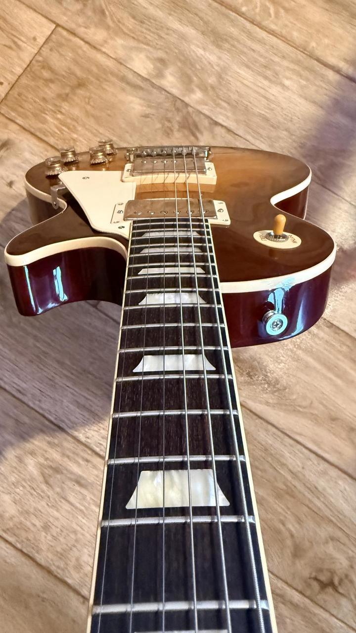 Kytara je ve výborném stavu, má krásny zvuk – bez škrábanců či jiného poškození, stačí naladit a můžete rovnou hrát. K prodeji nabízím vše, co je na první fotografii. Vše je ve skvělé kondici, některé věci jsou dokonce stále nerozbalené v původním balení. Něco k popisu: Jen málokterá elektrická kytara má tak ikonický status jako model Les Paul od amerického výrobce Gibson. Řada Les Paul Standard ‘60s navazuje na autentický design nástrojů z 60. let a zachovává původní konstrukci bez moderních úprav, jako je například odlehčování těla. Kytara má mahagonové tělo s fládrovaným javorovým topem kvality AA. Tenký nitrocelulózový lak podporuje přirozenou rezonanci dřeva a přispívá k lepšímu zvuku. Mahagonový krk doplňuje palisandrový hmatník s 22 pražci typu Medium Jumbo a trapezoidovými pozičními značkami z imitace perleti. Profil Slim Taper zajišťuje pohodlnou hru po celé délce hmatníku. O zvuk se starají dva humbuckery Burstbucker 61T/61R s Alnico V magnety, které nabízejí výrazný tón inspirovaný pozdějšími PAF snímači. K dispozici jsou dva ovladače hlasitosti, tónové clony a třípolohový přepínač.