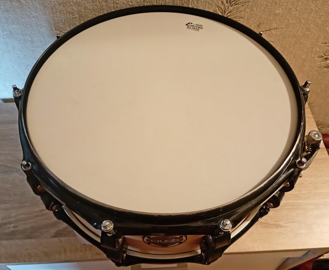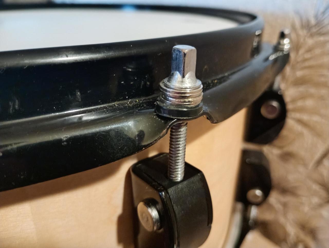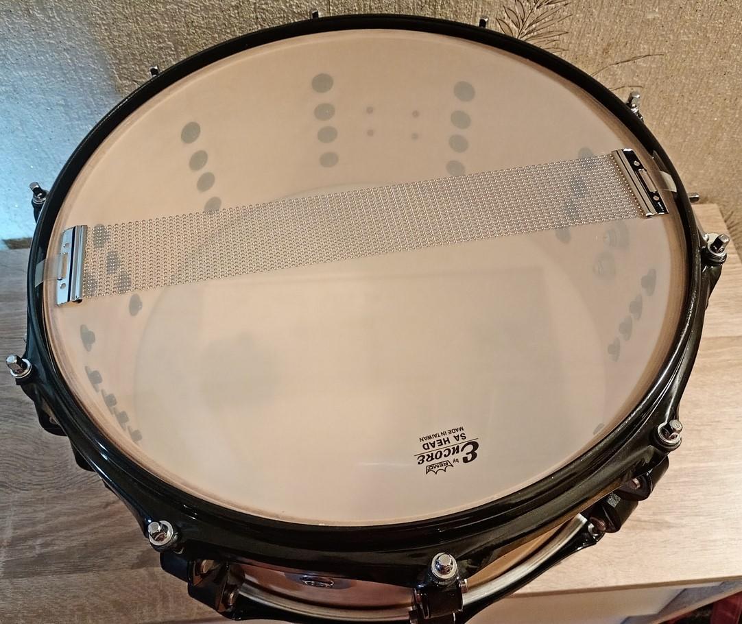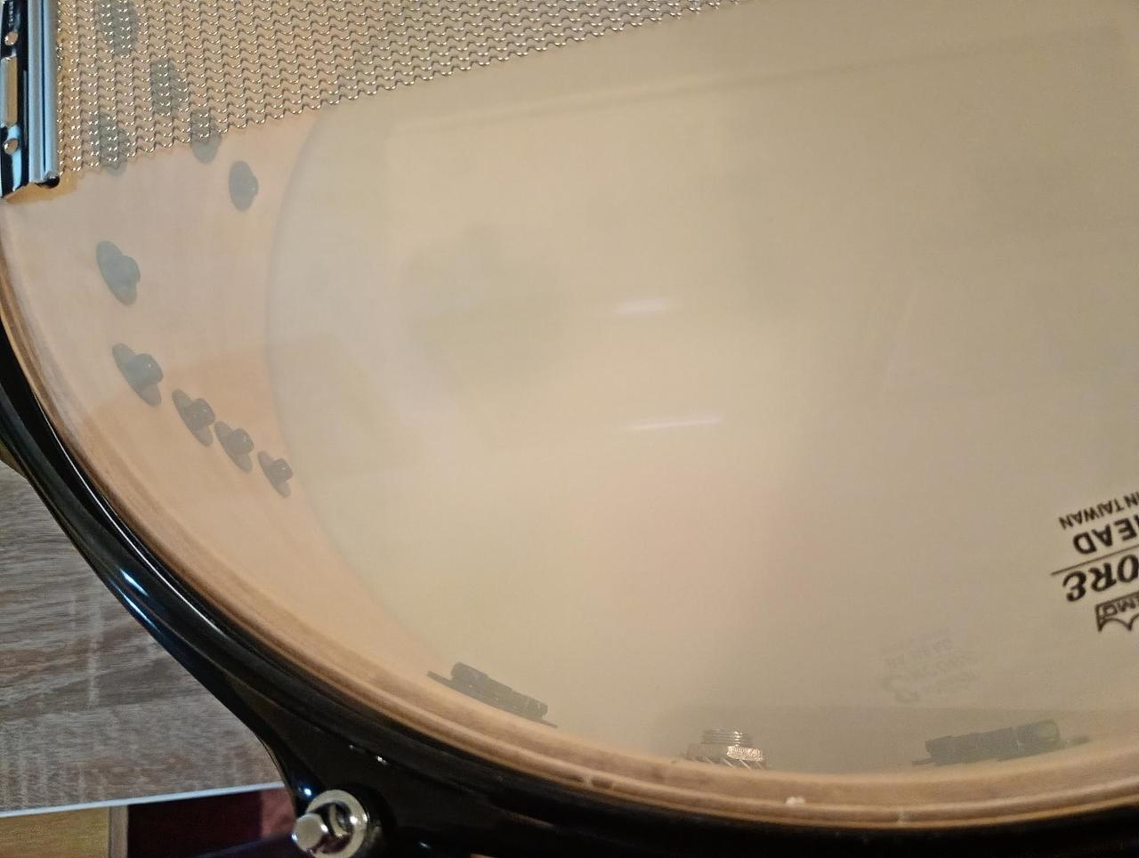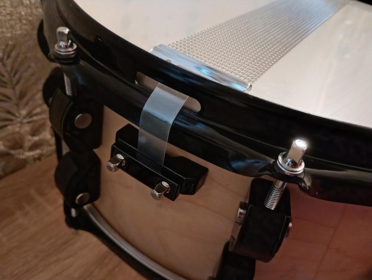 Bubínek jsem měl do šroubku rozebraný. Začistil jsem úložné hrany a promazal matice v mušlích. Odstraněna původní modrá fólie pro přírodní vzhled. Dva šrouby na hrací straně (naproti sobě) mají o dvě podložky více, protože jsou trochu delší (lze časem vyměnit, ale není to nutné). Stabilní ladění zajišťuje 10 ladících šroubů. Buben nese černý hardware až na napínák struníku, neboť jsem ho převrtal na jiný typ (původní jsem neměl k dispozici). Protikus zůstal v původní barvě (vizte foto). Zhruba na polovině obruče je patrné hraní (rim shoty), tedy ráfek je vyleštěný na ocel (vidno na foto). Nové blány Remo Encore Ambassador a nový struník o dvaceti strunách, uchycen plastovými pásky. Masivní, stabilní buben - váha je 4,2 kg. Pokud bude zájem, vyfotím jakýkoliv detail na přání. Přibližný zvukový projev v přiloženém videu (bílá verze). Zajímavý, všestranný virbl, který se ke koupi objevuje jen zřídka. Předám osobně v Havířově, nebo po dohodě můžu zaslat (+ poštovné).