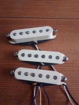 Žádné logo nemají, pouze ručně napsané hodnoty - 5.9, 6.4, 6.9 ohmu. Základna je fíbr, alnico magnety, pletené kabely, zavoskované, barva krytek něco jako oranžovější slonová kost. Hrají moc hezky, ale na všechny kytary dávám tuzemské snímače. Cena více než lidová