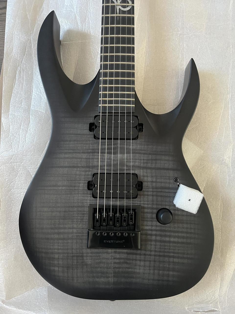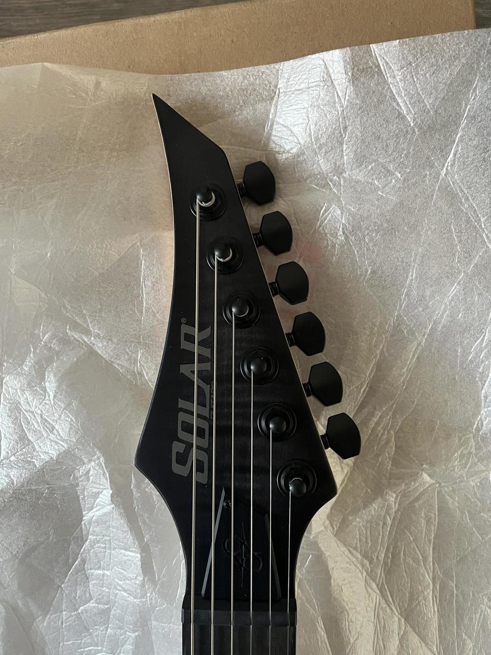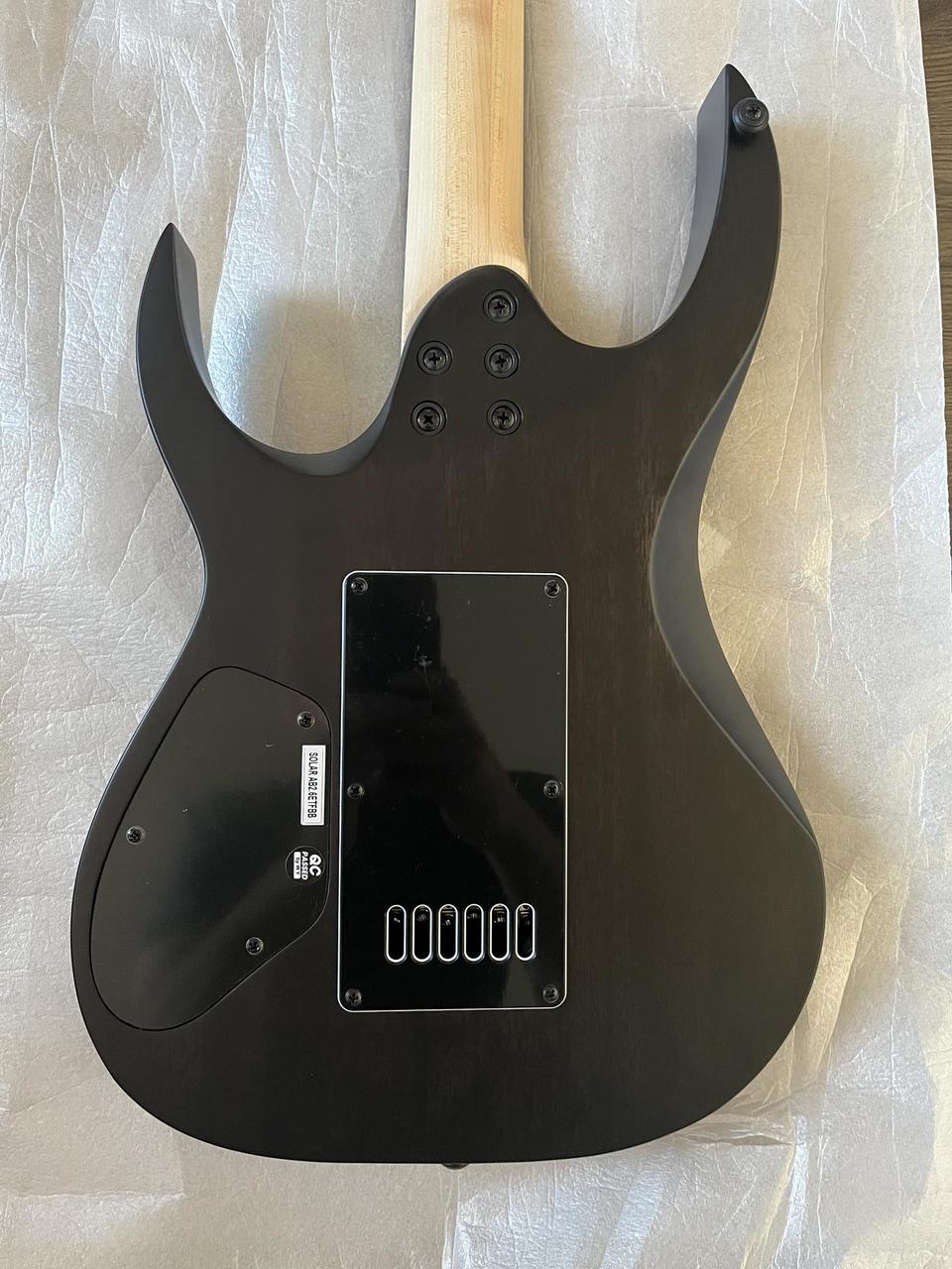 SPECS SERIES Solar, Solar TYPE AB NUMBER OF STRINGS 6 HARDWARE COLOR Black SHAPE FOR LEFT HANDED No MACHINE HEAD TYPE Solar 18:1 tuners STRINGS BRAND Blacksmith STRING GAUGES (9-46) TUNING E Standard TRUSS ROD COVER TYPE Solar Engraved Black SCALE 25.5 NECK SHAPE C Solar NECK MATERIAL 3 Piece Maple NUT PPS JOINING STYLE Bolt on TRUSS ROD Dual Action WIDTH AT 1F 43 mm (6 string) DEPTH AT 1F 20 mm DEPTH AT 12F 22 mm FRETBOARD MATERIAL Rosewood FRETBOARD RADIUS R350 POSITION MARKERS TOP None POSITION MARKER SIDE White dots 12TH FRET INLAY Solar Pearloid NUMBER OF FRETS 24 FRETTING STYLE Standard FRETWIRE MATERIAL Nickel BODY THICKNESS 45mm BODY MATERIAL TYPE Mahogany BODY TOP Flame Maple BRIDGE TYPE Evertune STRAP PIN TYPE Standard Solar Black PICKUP FRONT TYPE Solar Standard Alnico Humbucker PICKUP MIDDLE TYPE None PICKUP REAR TYPE Solar Standard Alnico Humbucker PICKUP TYPE Passive PICKUP MOUNTING STYLE Screwed into Wood VOLUME POTENTIOMETER TYPE 500k Volume pot KNOB TYPE Black Metal Dome SELECTOR SWITCH TYPE 5 way blade CONTROL COVER Gloss Black JACK TYPE Jack plate black matte FINISH HEAD TOP Flame Black burst Matte (FBB) FINISH HEAD BACKSIDES Natural Matte (N) FINISH NECK Natural Matte (N) FINISH BODY TOP Flame Black burst Matte (FBB) FINISH BODY BACKSIDES Trans Black Matte (TB) GIGBAG TYPE None TRUSS ROD TOOL Included INDIVIDUAL LENGTH MM 988,92 INDIVIDUAL WIDTH MM 306,24.
