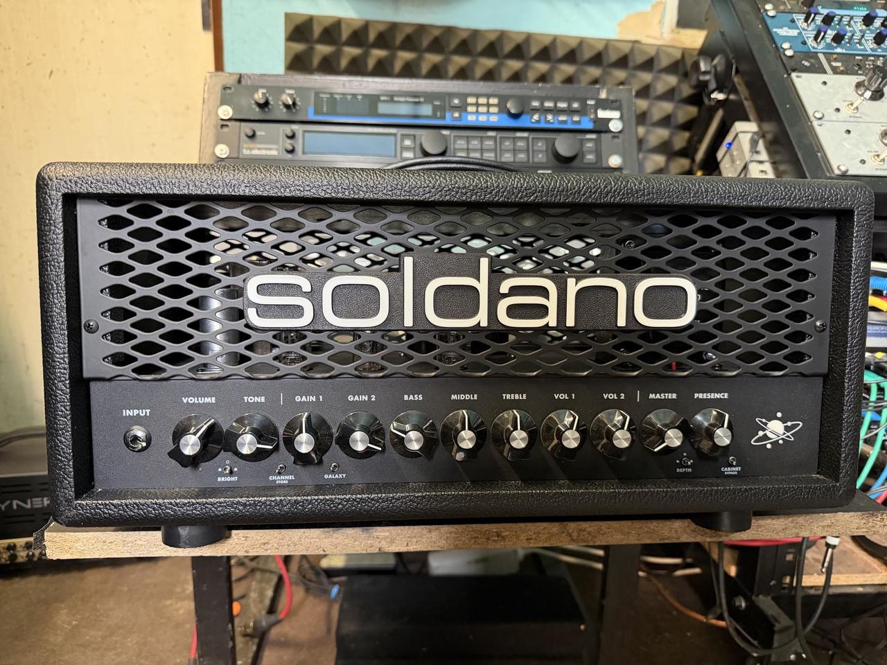Tři různé galaxie (tóny = modrá, fialová nebo červená) lze nezávisle přiřadit každému z kanálů overdrive pomocí přepínače Galaxy a uložit je pro okamžité vyvolání. „Modrá“ se pohybuje od bluesových čistých tónů až po hutné a pikantní hard rockové zvuky. „Fialová“ navazuje na zvuk „Modrá“ a přináší vyšší gain a hutnější odezvu. „Červená“ začíná ikonickými Soldanovými sólovými zvuky a pokračuje k novým, ještě intenzivnějším gainům. Software Soldano Editor umožňuje přiřadit galaxie kanálům overdrive, vybrat různé IR pro všechny tři kanály, načíst a uspořádat knihovnu IR a uložit až 128 MIDI presetů. Součástí je 4tlačítkový MIDI nožní spínač, který umožňuje ukládat a vyvolávat libovolnou kombinaci kanálů, galaxií a integrovaných IR. Zesilovač také akceptuje externí MIDI přepínače a kontrolery, takže si můžete vytvořit až 128 vlastních presetů. Provoz je možný i bez reproduktorů Výkon: 20 W Předzesilovačové elektronky: 4 x 12AX7 Koncové zesilovače: 2 x 6V6 Ovládání: Hlasitost, Tón, Gain 1, Gain 2, Basy, Středy, Výšky, Vol 1, Vol 2, Master, Presence, Úroveň hlasitosti sluchátek Přepínače: Bright, Channel/Store, Galaxy, Depth, Cabinet/Bypass Výstupy reproduktorů: 4 Ohm / 2 x 8 Ohm (2 x 6,3 mm jack), 8 Ohm / 2 x 16 Ohm (2 x 6,3 mm jack), 16 Ohm (1 x 6,3 mm jack) Vstup: 6,3mm jack Nožní spínač / MIDI: 5pinový DIN Vyvážený výstup: XLR Send/Return efektové smyčky: 2 x 6,3 mm jack Rozměry (Š x H x V): 483 x 229 x 248 mm Hmotnost: 11,8 kg Včetně 4polohového MIDI nožního spínače Vyrobeno v USA IBA PREDAJ !!!