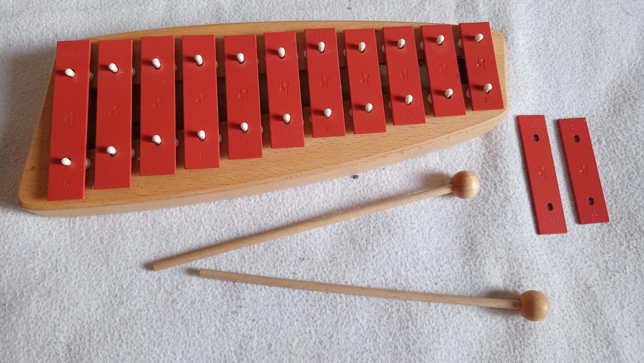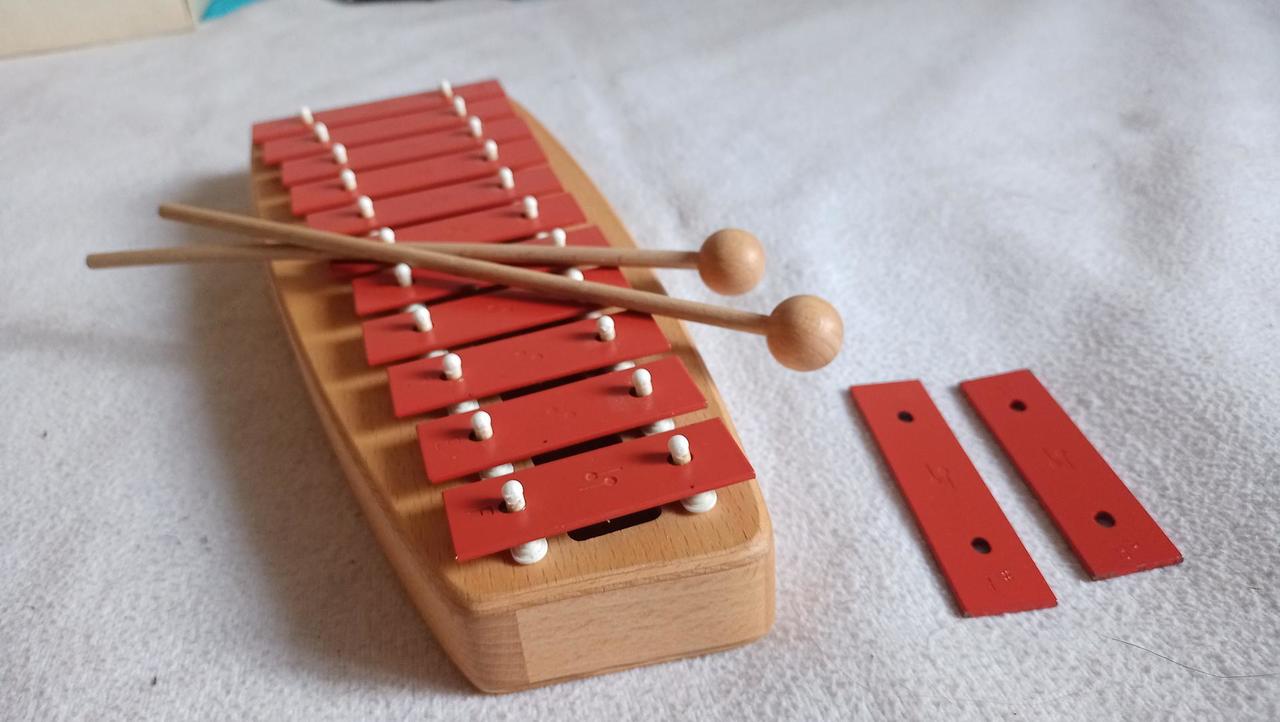 laděná v tónině C dur. Disponuje 13 kovovými destičkami vyrobenými z oceli s laděním do tónů c3, d3, e3, f3, fis3, g3, a3, b3, h3, c4, d4, e4, f4. Rezonátor na kterém jsou umístěny kameny, je vyroben z bukového dřeva v naturální úpravě. Pár hůlek je součástí balení. vyrobeno v Německu Rozsah: C3 - F4 Stupnice C dur s takty F#3 a B3 13 tónů Základní ladění Červené ocelové soundbary ve formátu 20 x 2 mm Rezonanční box vyrobený z masivního, uzamčeného bukového dřeva