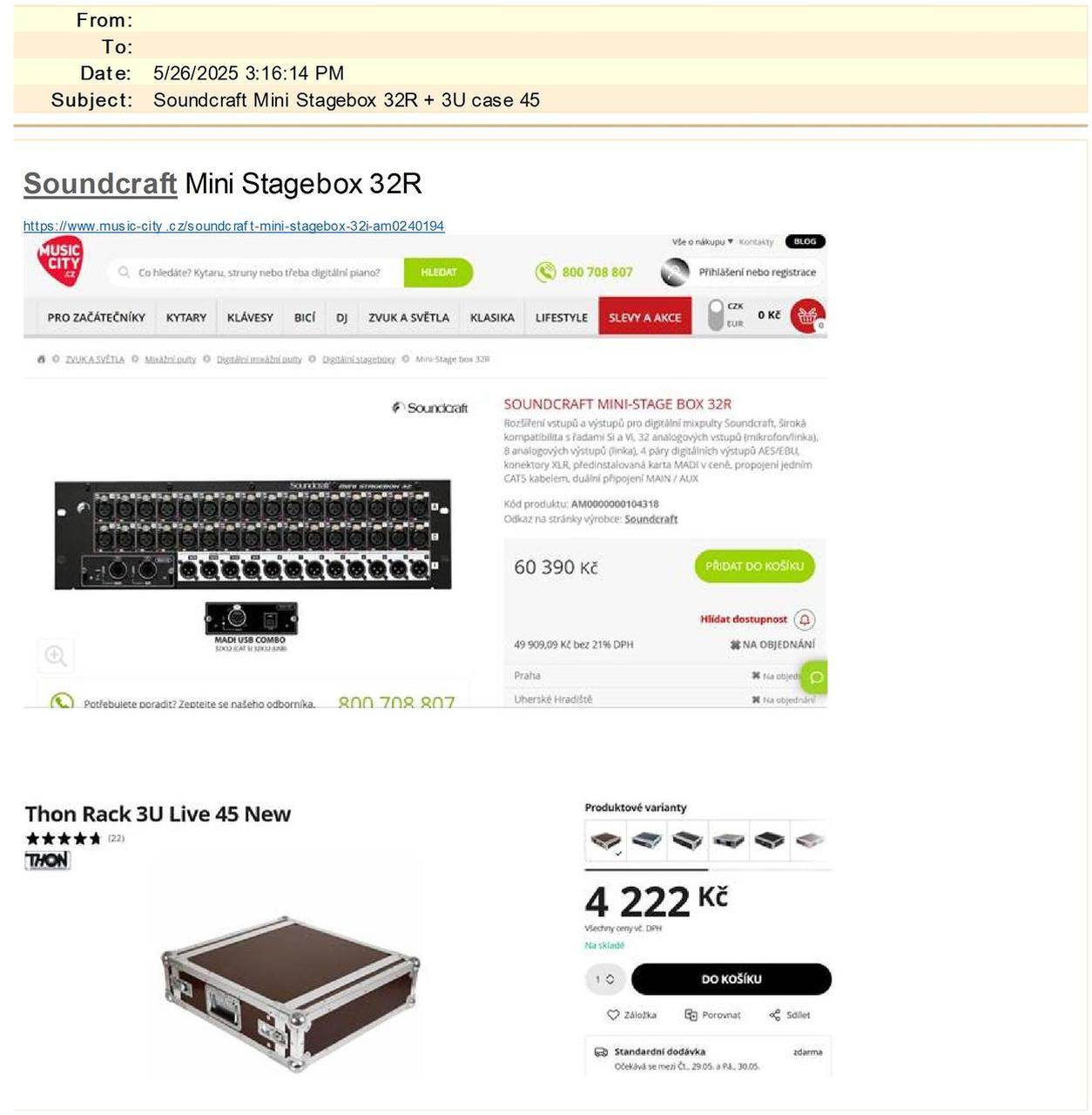 - SOUNDCRAFT Si Impact, digit mixpult + orig case THON, vč. českého manuálu. Nabízí 40 DSP vstupních kanálů, 32 mikrof. vstupů (24 XLR, 8 kombi XLR/TRS) a 31 výstupů. Každý vstup má čtyřpásmový plně parametrický ekvalizér. Nastavení faderů indikují vícebarevné LCD displaye. Multiefekt nemá pouze výkonný DSP, ale disponuje efekty Lexicon (reverb, delay, modulation) ve studiové kvalitě, legendární dbx dynamikou a BSS grafickými ekvalizéry. USB audio rozhraní s 32 vstupy/výstupy zaručuje rychlé a snadné nahrávání/playback. Pořizovací cena 93 000 Kč Prodám za 59 900 Kč dále - SOUNDCRAFT Mini StageBox 32 + Flight Rack 19" 3U/45 + manual Poskytuje 32 mikrofonních/linkových vstupů, 8 linkových výstupů a 4 páry AES/EBU výstupů. Propojení s mixážními pulty pomocí kabelu Cat-5. Pořizovací cena 59 000 Kč Prodám za 39 900 Kč dále - PROPOJOVACÍ KABELY (mix / StageBox) - Cat5e Cable 30m (na cívce) - pro snake - Cat5e Cable 75m (na bubnu) - pro snake Zástrčka RJ 45 na obou koncích s odnímatelnou průchodkou pro zásuvku formátu D nebo jiných Extrémně robustní kabel pro -20°C až +60°C Vnější průměr: 7,5 mm Pořizovací cena 7 000 Kč Prodám za 4 900 Kč Vše v perfektním stavu. Jsem první majitel - kapelový aparát. Hrálo tak max 5x za rok (ostatní koncerty kapely byly na ozvučené stage) Důvod prodeje: Nevyužité, leží na suché zkušebně. Už věci netaháme a hrajeme jen malé akce na malý aparát. (jsme veteráni) - bolí záda) Místo odběru Bruntál. Možno zaslat přes Vámi zvoleného dopravce po předchozí platbě na účet (cena + poštovné). Po dohodě možno přivézt (10,-Kč/km) Kontakt 602 744 762, krc@atis.cz