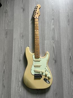 Prodám elektrickou kytaru Squier Pro Tone Stratocaster v barvě Vintage Blonde vyrobenou v roce 1997 v Jižní Koreji. Kytara původně zakoupená bazarově z USA je na své stáří ve výborném stavu (vyjma pár prasklinek a škrábanců na laku - viz foto), nicméně servis by nebyl na závadu. Struny na kytaře pravděpodobně Ernie Ball 2221 Nickel Wound Regular Slinky (.010 - .046).