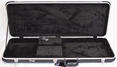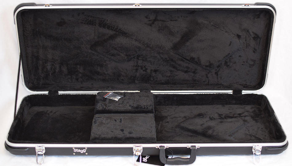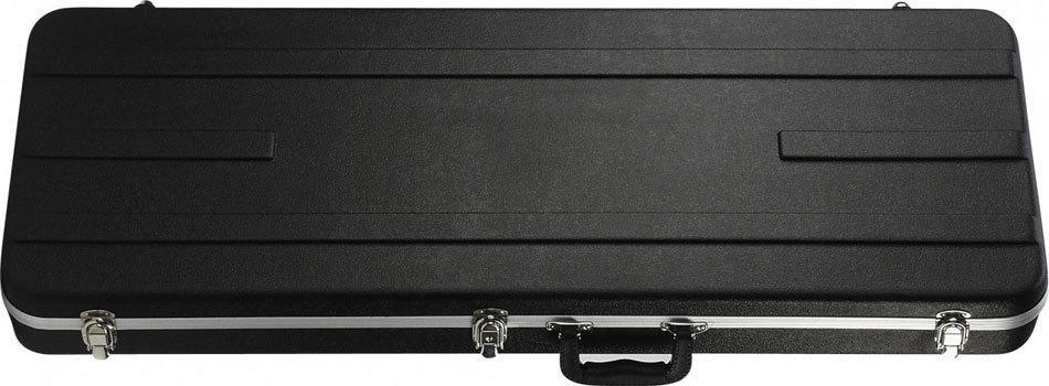 Čtyřhranný lehky, ale pevný kufr pro elektrickou kytaru z černého plastu ABS, hliníkový obvodový profil, vnitřek černý plyš, schránka na příslušenství, chromové zámky, pevné ucho.