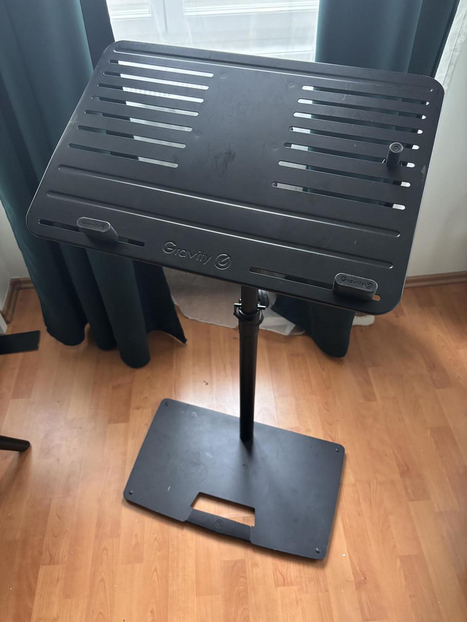 Prodám plně funkční stojan na laptop. Všechny závity naprosto v pořádku. Jediná vada je, že jsem někde ztratil jeden z pinů určených k upevnění počítače, ale pro použití nejí nezbytně nutný a myslim, že se případně dá snadno ubastlit náhrada. Stojan má těžkou základnu - je extrémně stabilní - vynikající na živé použití.