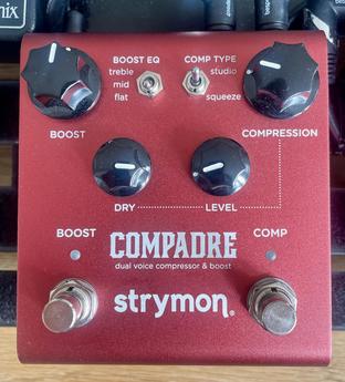 Strymon Compadre je prémiový kompresor a boost pro kytaru i baskytaru. Nabízí dva režimy komprese, clean i dirty boost, možnost paralelní komprese, přepínatelný true/buffered bypass a podporu presetů přes externí switch nebo MIDI. Profesionální studiová kvalita v kompaktním pedálu.
