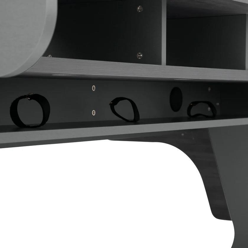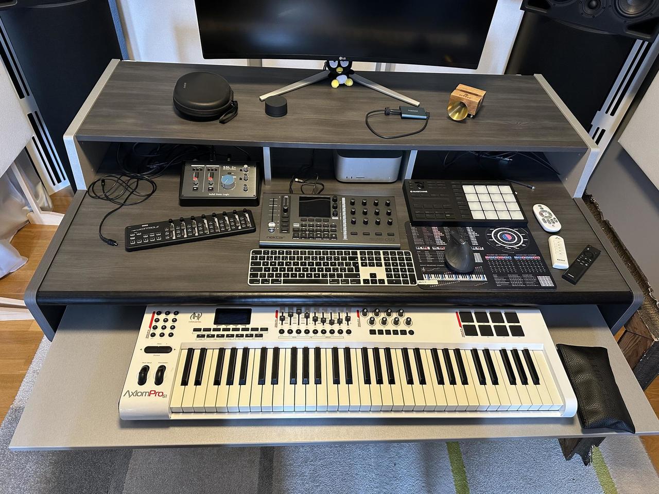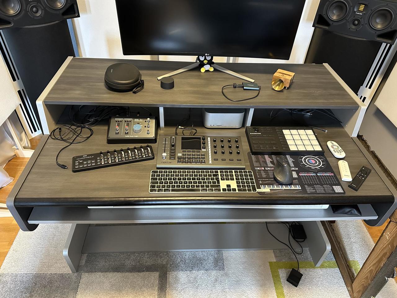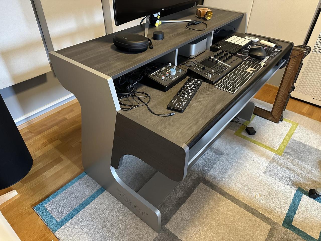 Studiový stůl Zaor Miza 88 Flex Wengé Grey v perfketním stavu, jako nový, bez škrábanců a známek používání. Důvod prodeje = stěhování studia do nových prostor, kam se nehodí. Obsahuje výsuvný šuplík na klávesy, 2 x 3 U 19" rack, vzadu prostor pro kabely.