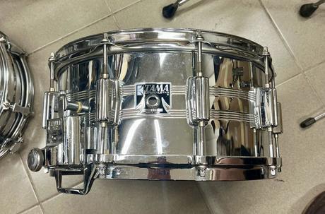 - buben z 80. let ve výjimečně dobrém stavu, pouze na struníku uvolněná jedna pružina; na tlumítku chybí rychlozapínací kroužek, takže funguje jako běžné, nikoli rychlo - díl se dá velmi snadno sehnat, na rozdíl od celého tlumítka, které na mnoho z nich chybí - tady je :) ; a vrchní ráfek je, podle vzpomínek prvního majitele, původní, nicméně co vím, Tama je dělala lité. Na druhou stranu nemám důvod nevěřit, že tento není původní. Podle mnohých nejlepší ocelový virbl, co kdy byl vyroben. Tama aktuálně dělá reedici za 20000,--