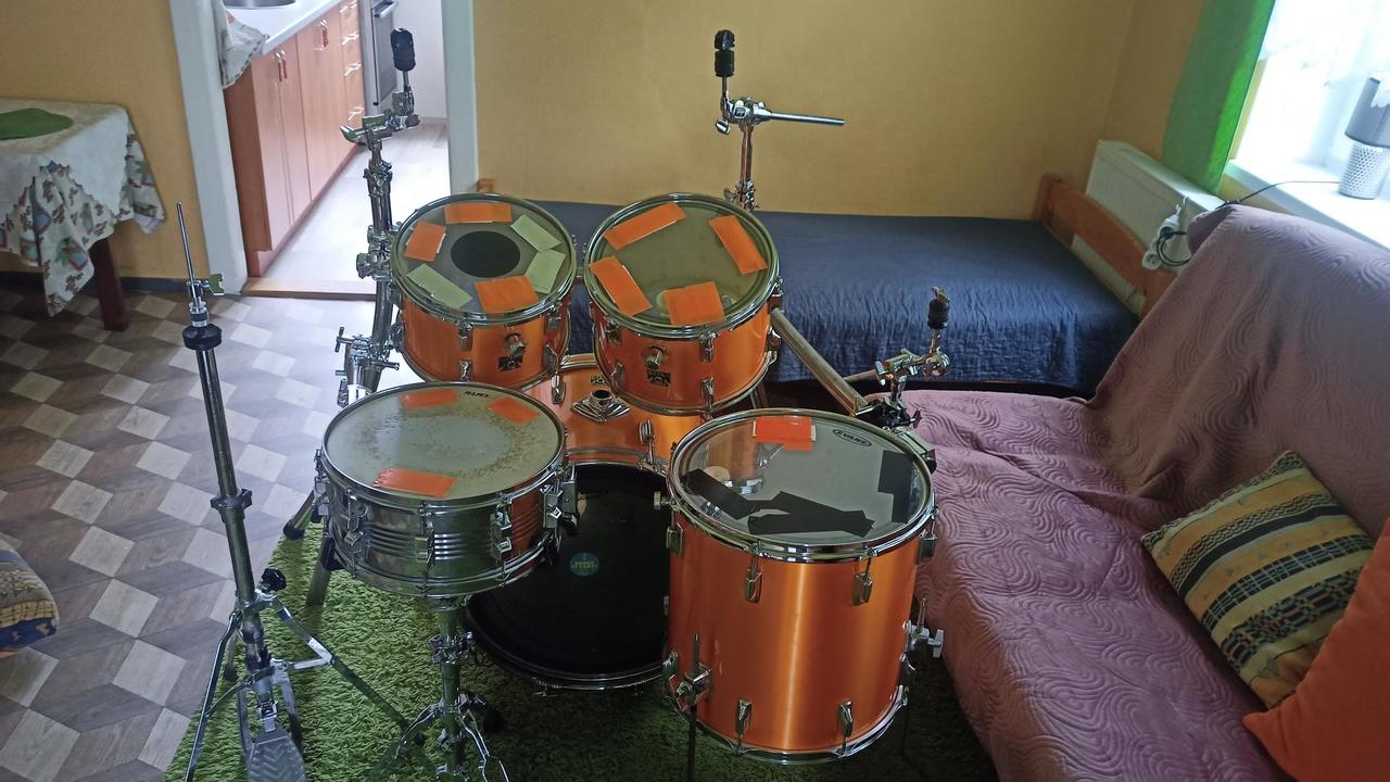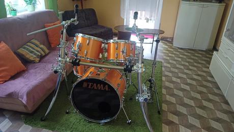 Bubny TAMA Imperialstar z 80. tých let, made in Japan , žádná čína!!! Filipínský mahagon, rozměry 22",12",13",16", bubínek Mapex 14" x 6,5", včetně Hi-Hat, stojánek na bubínek a rampa stavěná na zakázku s činelovými rameny Pearl nejvyšší řady viz foto.