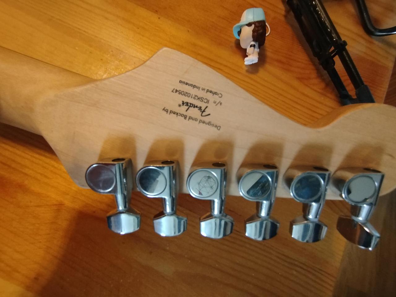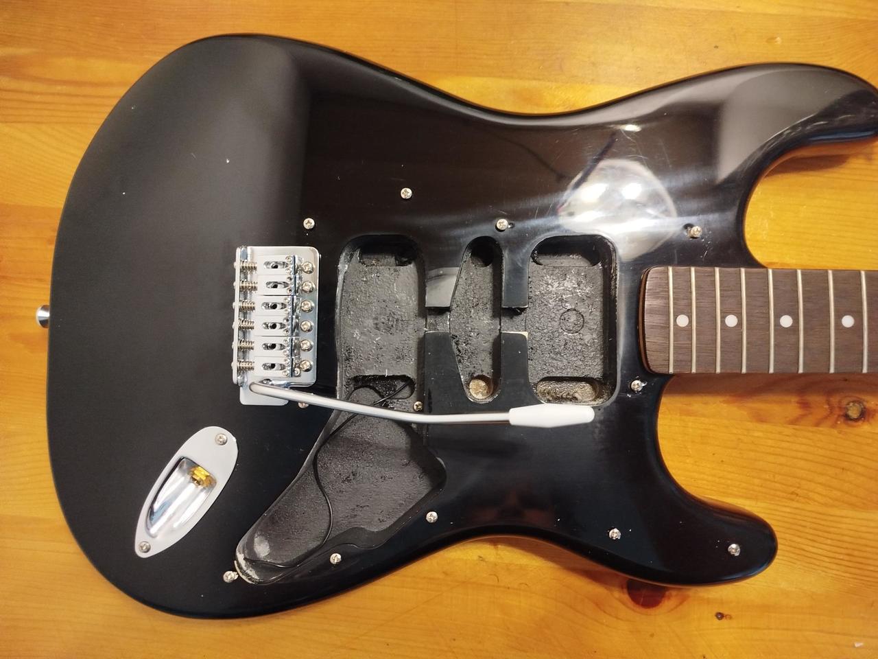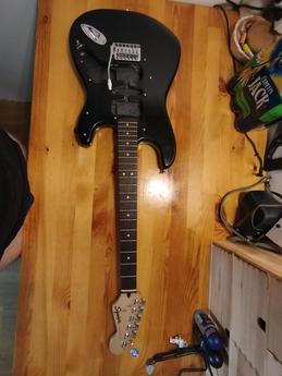 Telo je z topola a frezovane na HSH. Krk aj prazce su prekvapivo zarovnane a bez potreby opravy, drevo- javor. Hmatnik je z laurelu a asi 2 mesiace dozadu som ho riadne naolejoval citronovym olejom dunlop. Za 10€ viem dohodit original snimace z tejto gitary (SSS) pripadne squier jazzmaster snimace (±p90) pre ktore by ale bolo potrebne dofrezovat dieru. Posielam aj postou