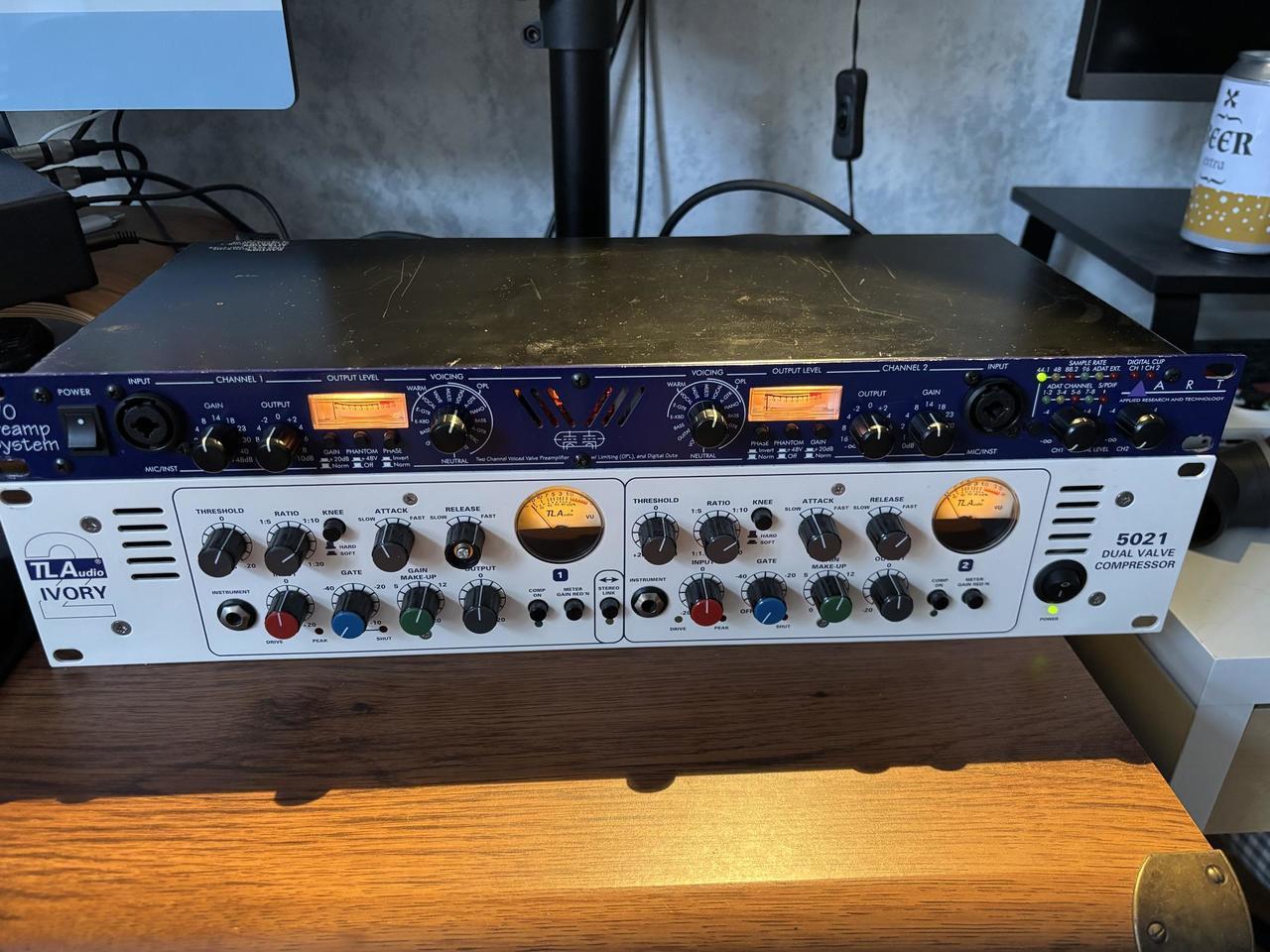 TLA Ivory 2 5021 - dvoukanálový lampový kompresor. Ovládání Input, Gain, Output, Gate, Treshold, Ratio, Attack, Knee, Release. Jeden knob je bez vrchní části.