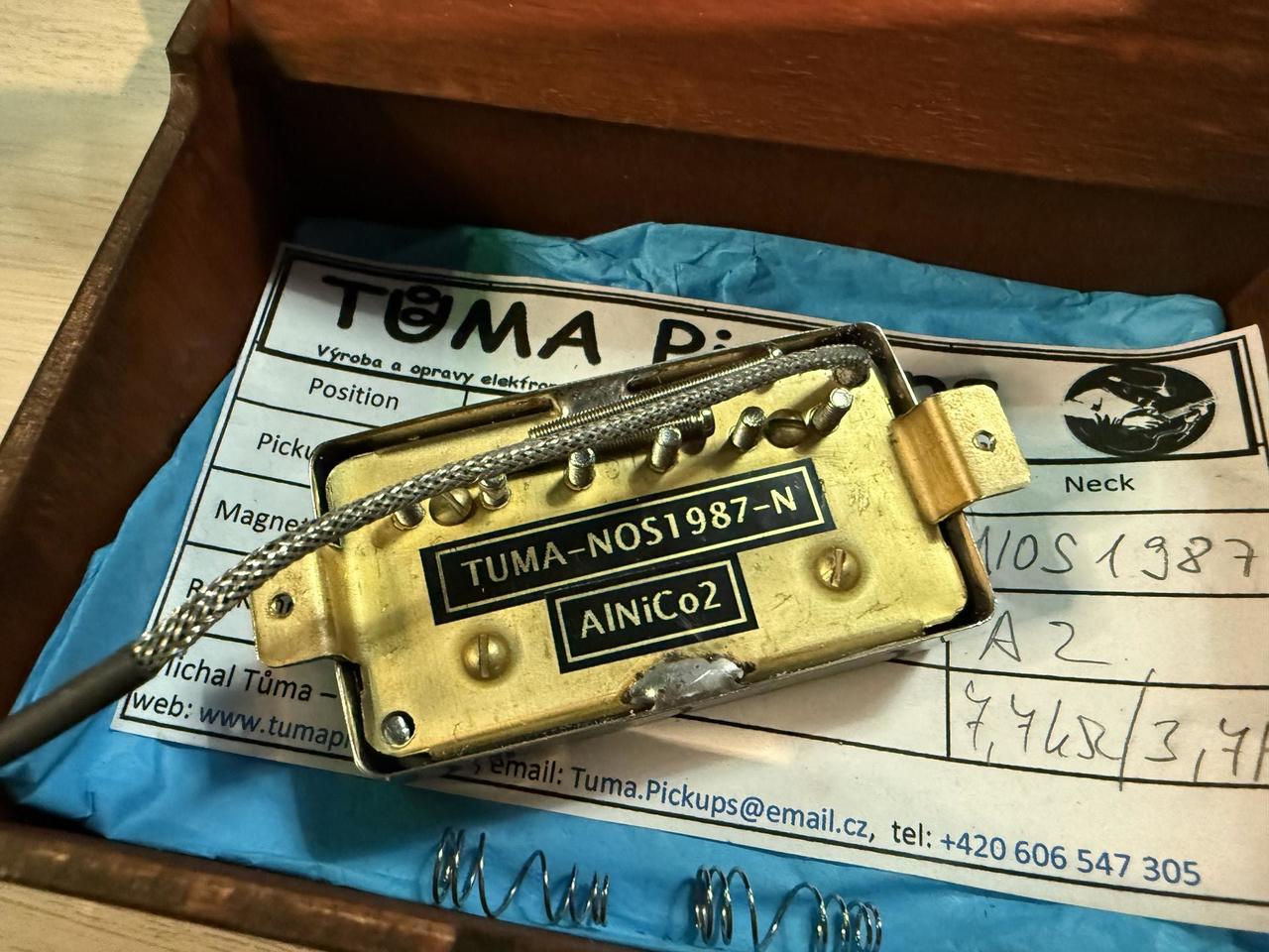 Prodám tento luxusní snímač od Michala Tůmy. Je to humbucker ve stylu PAF, NOS 1987. Minimálně používaný, asi půl roku starý. Je umotaný z nějakého starého drátu a hraje opravdu perfektně. Má lehký relic - tak akorát, aby vizuálně nevyčníval, když ho dáte na ne uplně novou kytaru.