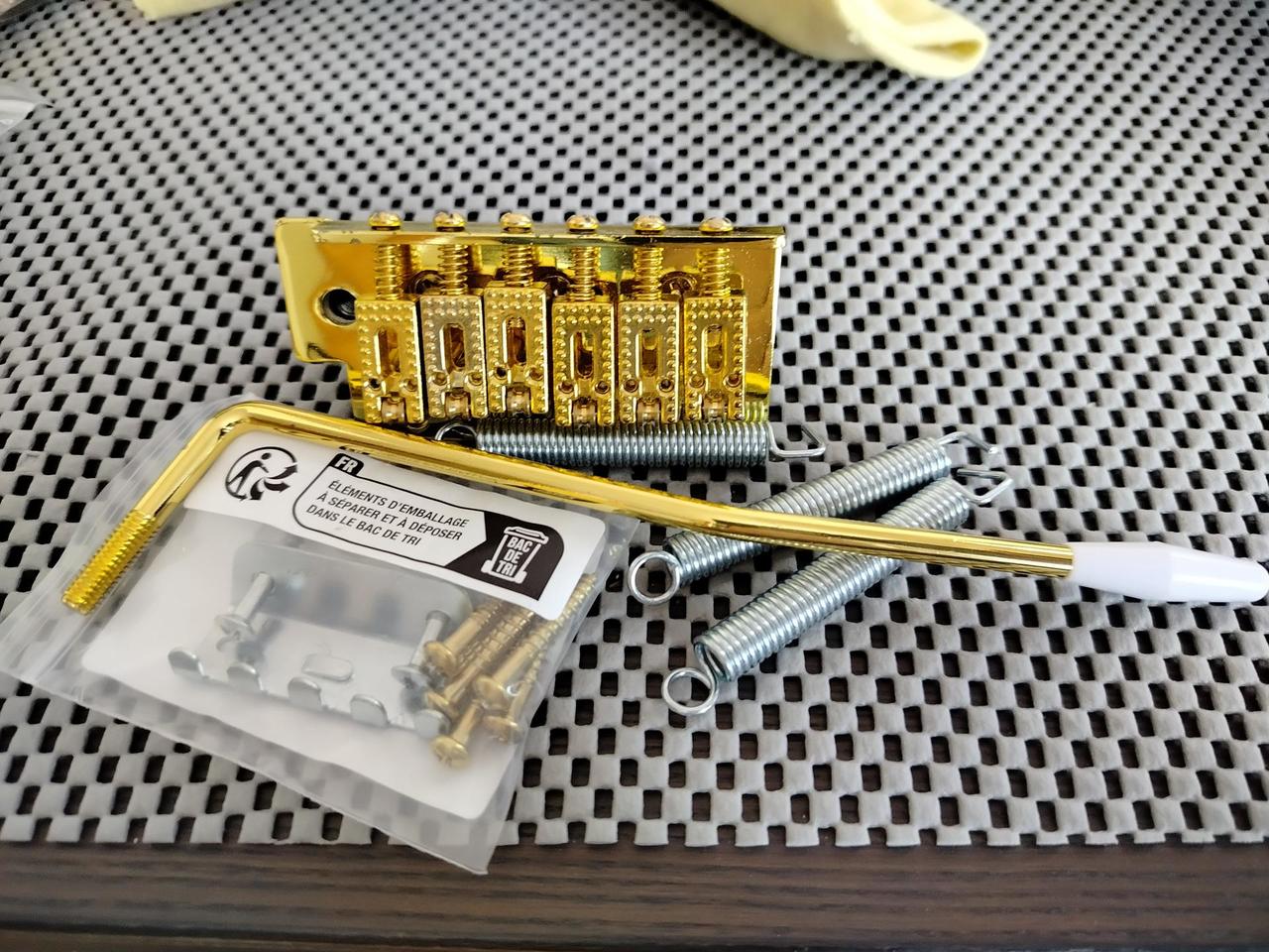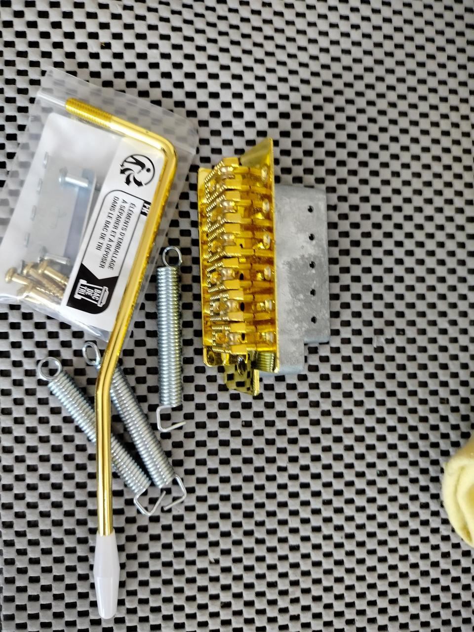 Prodám zlaté tremolo na Stratocaster, standartní rozměr, kompletní balení,tremolo, páka, pružiny, šrouby, držák pružin, pouze odzkoušené,100% stav.