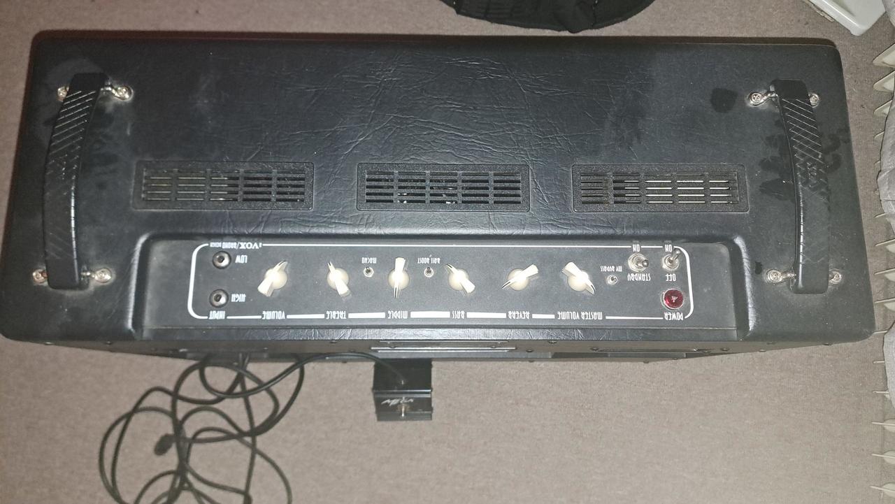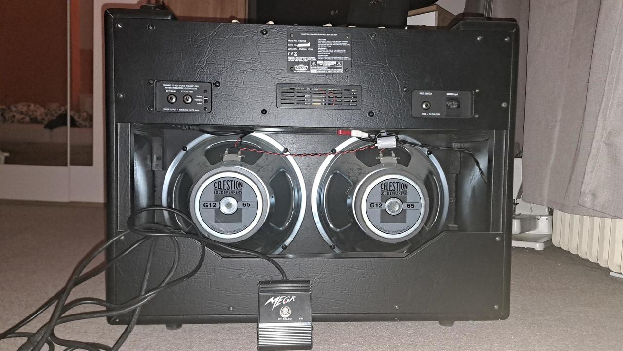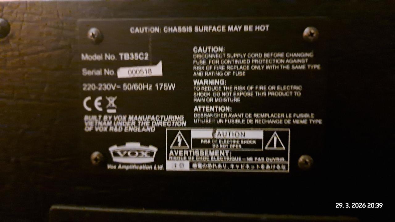 Větší z této řady, Vox TB35C2 disponuje výkonem 35 wattů, který mu dodávají dvě lampy typu 6V6. V preampové sekci pak nalezneme tři 12AX7 elektronky, které ještě doplňují další 12AX7 a 12AT7 pro reverb. V powerampu je použit speciální katodový rezistor, který výrazně prodlužuje životnost elektronek. O přetavení výkonu ve zvuk se starají dva 12 palcové reproduktory Celestion G12-65. Pokud se podíváme na horní ovládací panel, nalezneme zde následující: Zcela vpravo se nachází dva vstupy pro kytaru. Za vstupy se nachází potenciometr Volume, který slouží jako ovladač gainu a ovladače Treble, Middle a Bass. Mezi nimi se nachází přepínače Tight a Macho. Macho spínač přidává na gainu a středových frekvencích, Tight slouží jako Bass-boost zesilující hluboké frekvence. Dále nalezneme ovladač Reverbu a klasický Master Volume pro nastavení celkové hlasitosti. Za nimi už je jen Power a Stand-by spínač. Zapomenout ale nemůžeme ani na Master Bypass spínač, kterým lze z obvodu vyřadit Master Volume – to jistě ocení mnozí tónoví puristé a staromilci. Na zadním panelu nalezneme klasické prvky, tedy vstup pro síťové napájení, vstup pro footswitch a dva paralelně zapojené výstupy pro reproboxy. Výstupy jsou označeny jako Extension a External, přičemž Extension je zapojený paralelně s interním reproduktorem, při připojení do External se vnitří repro odpojí. Moje ideální představa o ceně, tedy cena k jednání je 22.000,-