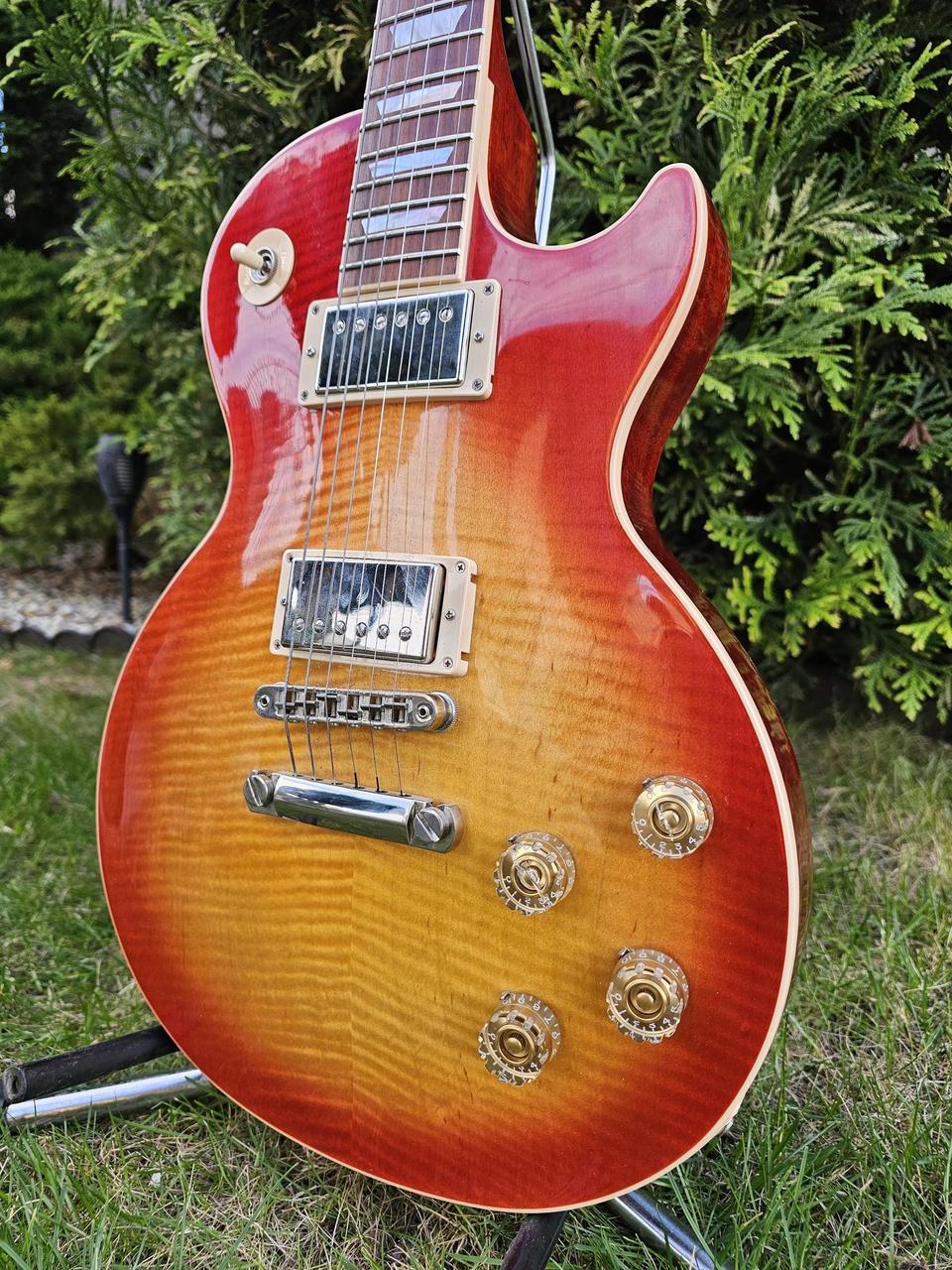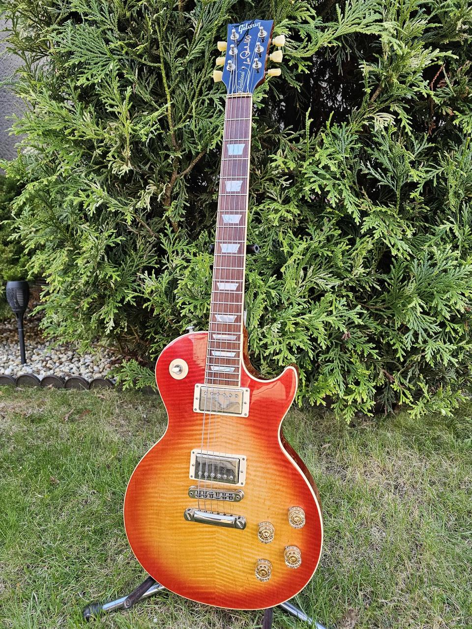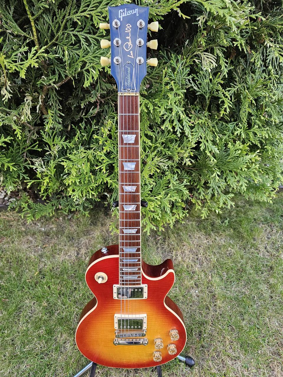50's krk - tučnejší. Telo bez akýchkoľvek odľahčovacích otvorov - tak ako Custom Shop gitary. Fládrový top vyššej triedy. Táto limitovaná séria nemala žiaden pickguard - nebol ani nikdy navŕtaný do tela. Gitara prišla už z továrne so štandardnými vintage mechankami - nie elektronické G-Force. Má pár menších ťukancov ale je v super stave. Súčasťou je certifikát, ďalšie papiere... Na výmenu hľadám Les Paul Standard alebo Traditional v sunburst finishi, s tučným 50's krkom a s opravovanou hlavou (!) + doplatok minimálne 500 eur. Ťukance, škrabance, odreniny sú vítané! Pražce by však mali byť v super stave. Ponúkam ju k výmene, rovnako ako požadujem gitaru z vašej strany - bez kufra. Gitaru môžem aj predať (2200€) - v takom prípade je súčasťou aj originálny zlatý kufor.