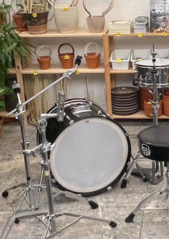 Starší Pearl Export v leskle černé barvě, na úderovce je zpevňující terčík pro dvojšlapku, v korpusu 2 otvory pro umístění tomů. Buben je ze dřeva a má kovové ráfky.