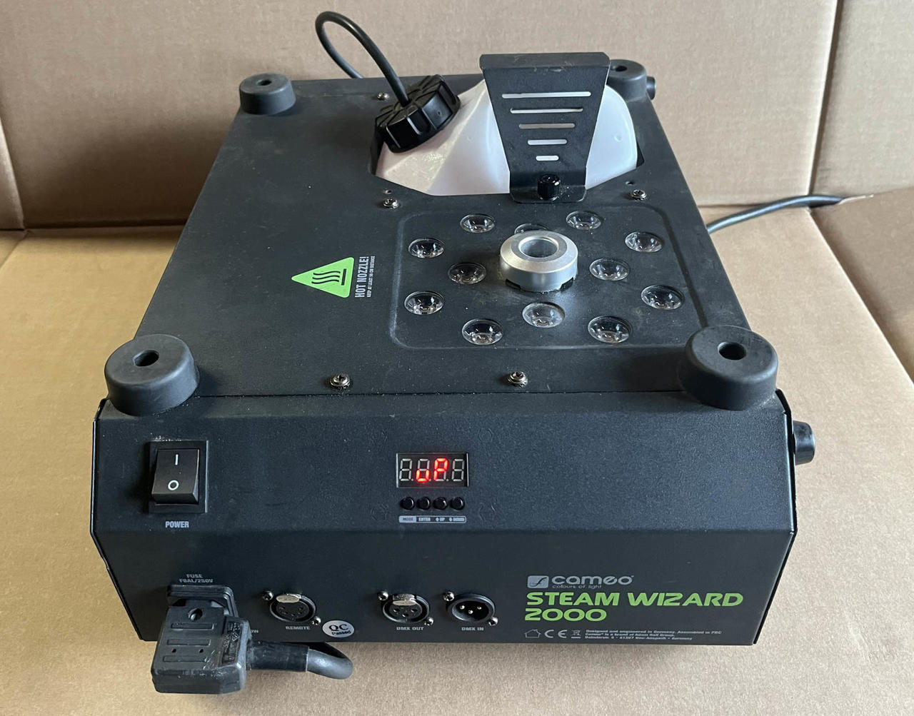 S 12 x 10W RGBA 4-v-1 LED diodami Vhodné pro horizontální i vertikální provoz Topné těleso o výkonu 1200 W s výkonným čerpadlem pro velký výkon mlhy Stroj se automaticky vypne, když je nádrž prázdná, aby se zabránilo poškození čerpadla LED displej pro zobrazení hladiny kapaliny a provozního stavu Včetně 10m kabelového dálkového ovládání (funkce: nepřetržitý výstup, časovač, hlasitost výstupu mlhy, jas a barva LED diody) Použitý ,bezvadný stav , cena 4500,-kč.