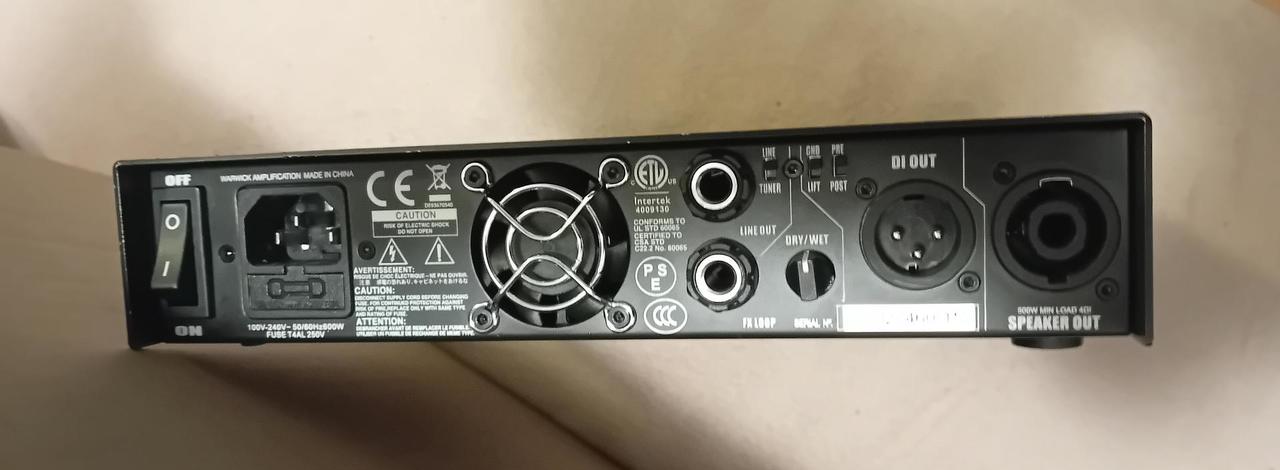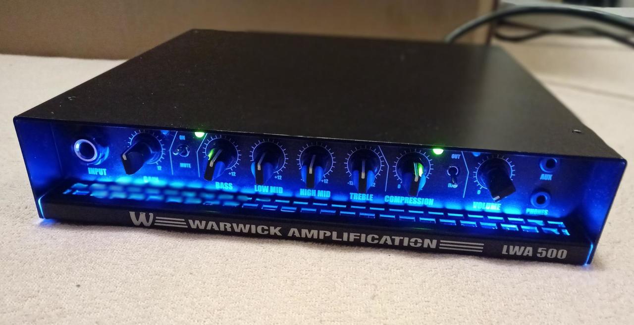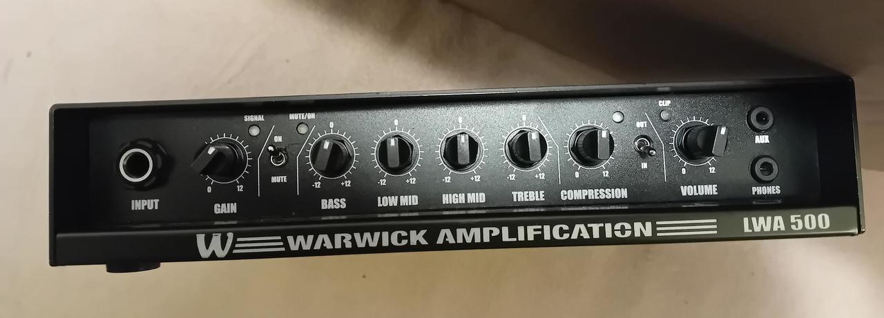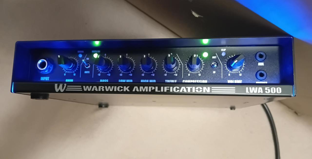 Prodám Warwick LWA-500-BK, na opravu. Nyní lze používat jako předzesilovač. Korekce, kompresor, výstup do mixu DI box, efektová smyčka, Aux, výstup na sluchátka, vše je funkční, ale nefunguje koncový stupeň. Specifikace: Kompaktní lehký baskytarový zesilovač s výkonem 500 W. Zesilovač je vybaven předzesilovačem třídy A s nízkoimpedančním vstupem pro eliminaci zkrelsení. O koncové zesílení se stará zesilovač třídy D. Přední panel je vybaven přepínačem pro funkcí Mute, ovládáním pro vestavěný kompresor, Master Volume a třípásmovým ekvalizérem s parametrickými středy. Samozřejmostí je i vestavěná efektová smyčka, výstup pro DI, výstup pro ladičku, vstup Aux In, výstup pro sluchátka a výstup pro reprobox s impedancí 8 Ohm nebo 4 Ohm. Rozměry (Š x V x H): 222 mm x 44 mm x 210 mm