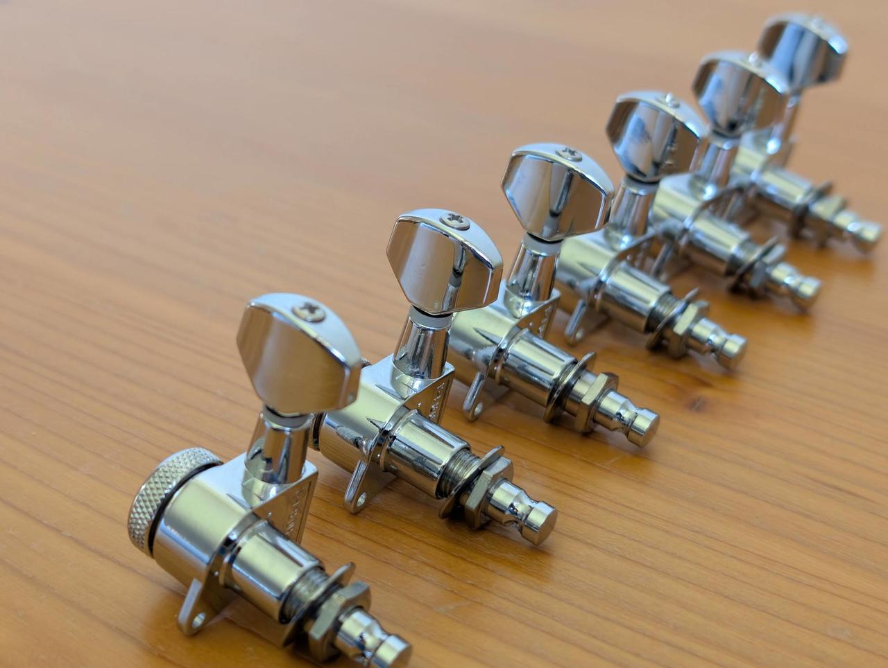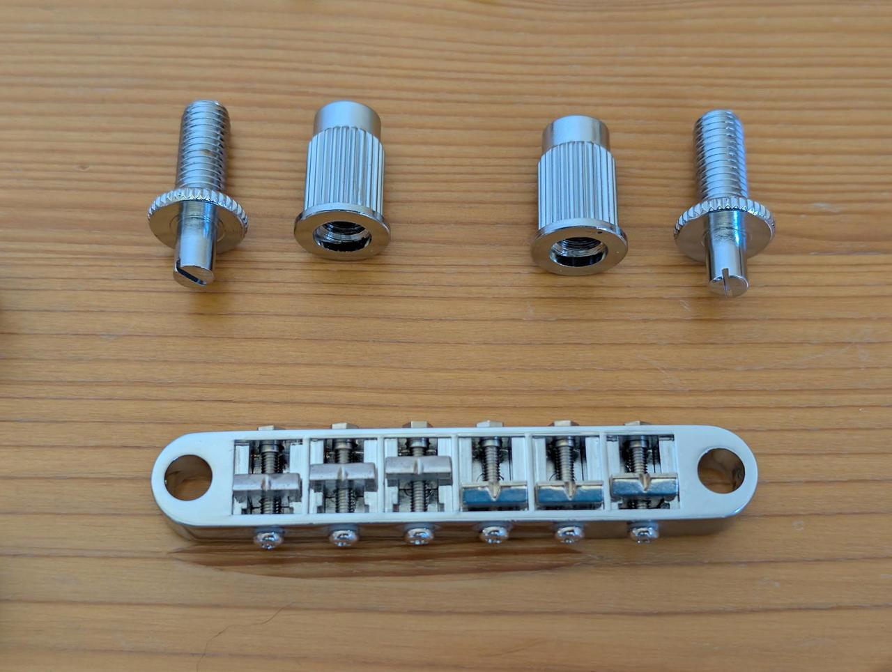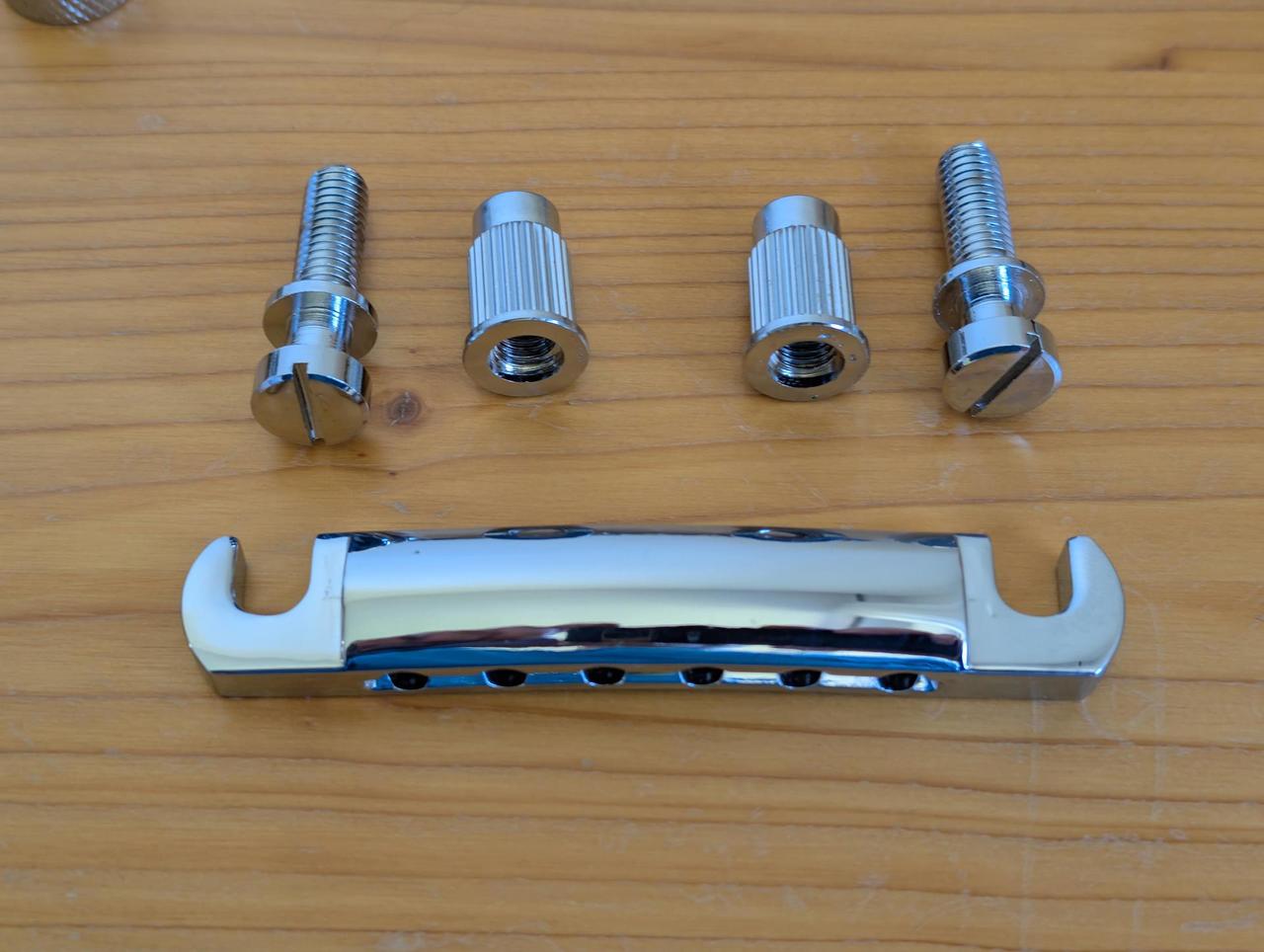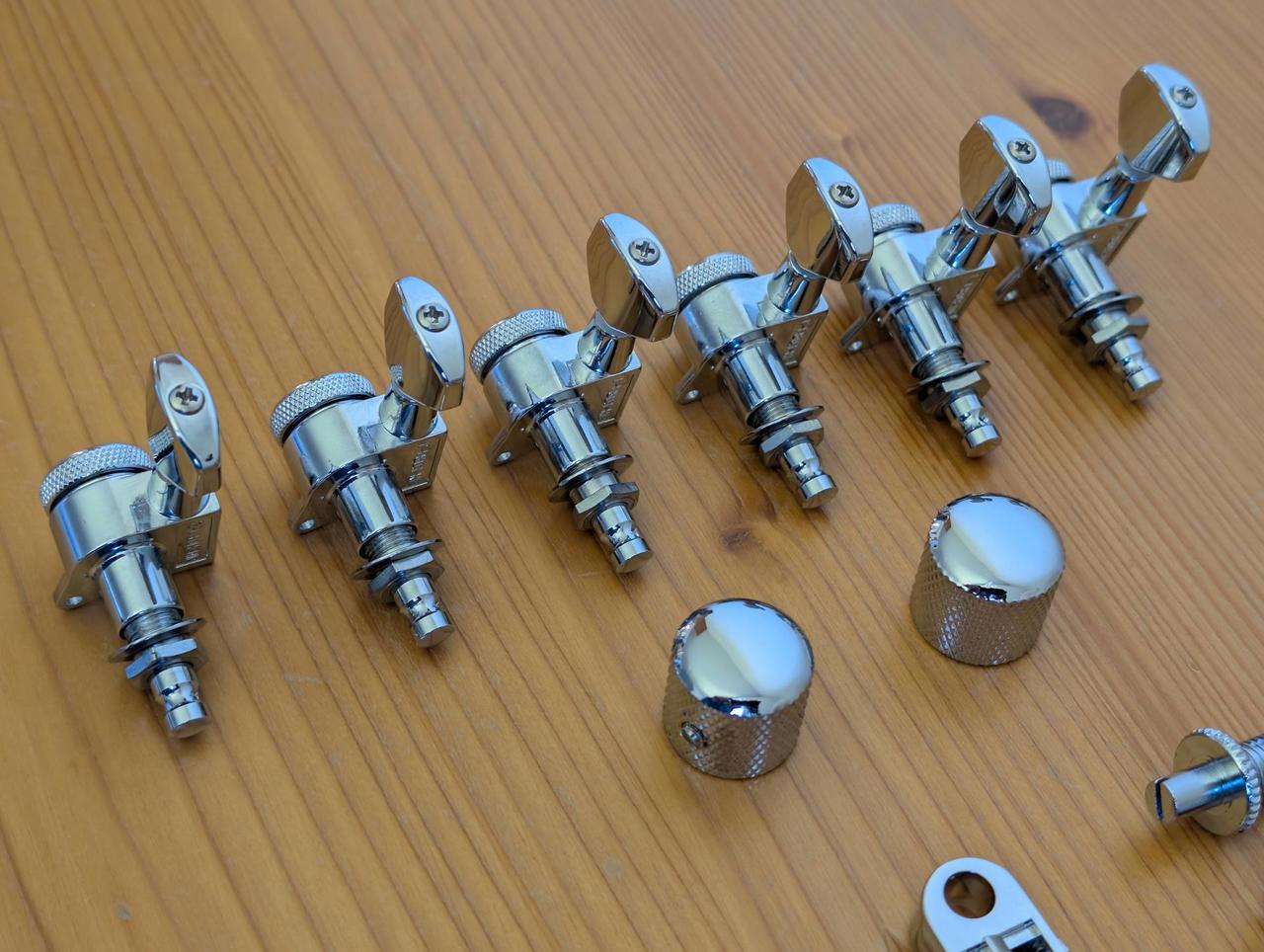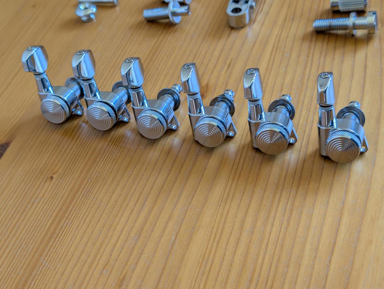 Ideální na upgrade nebo stavbu kytary - mechaniky jsou kvalitní a velmi precizní. Cena kompletu: 1.000,- + poštovné při prodeji po částech: Zamykací ladicí mechaniky (6L) – 800 Kč Tune-O-Matic kobylka + Stopbar struník včetně trnů – 400 Kč x kovový knob na potenciometr – 100 Kč x rolna na popruh včetně vrutů – 50 Kč