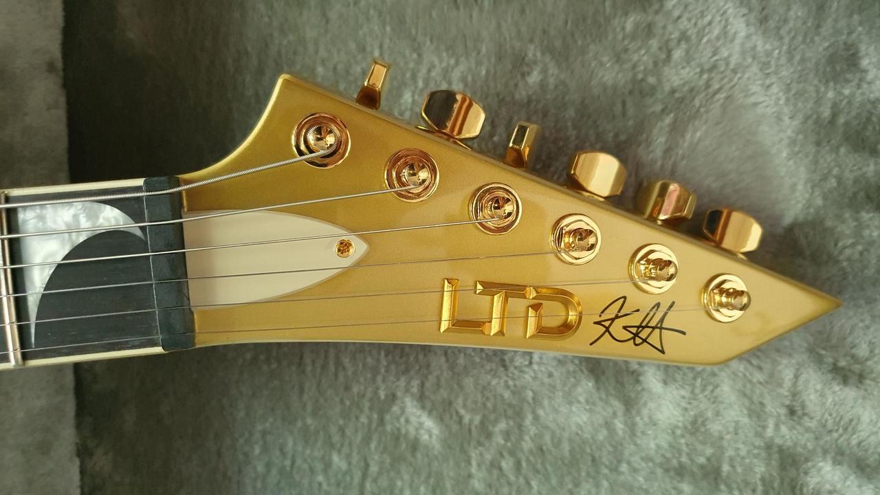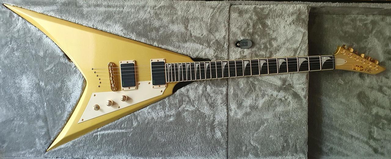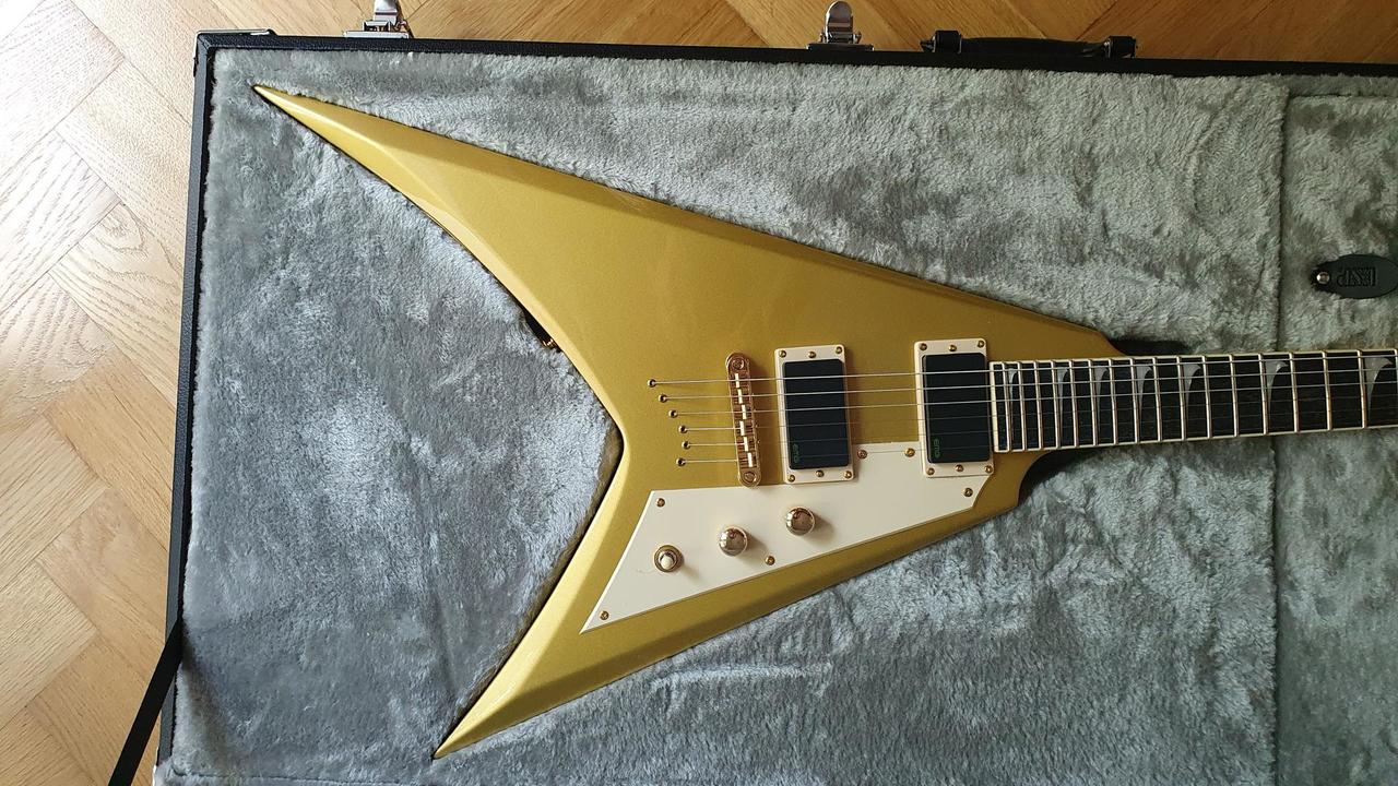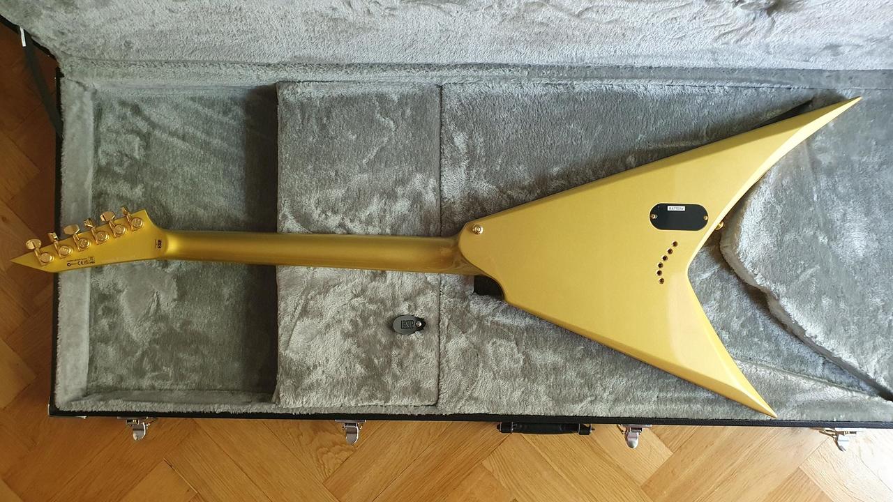 Postupný rozprodej mojí sbírky ze zdravotních důvodů dospěl ke kytarám ESP. Nerad tedy dávám k prodeji tuhle nádhernou a skvěle zpracovanou šipku/véčko KH-V, Signature model Kirka Hammetta (Metallica) z řady LTD Deluxe - vyrobená v Koreji (ne v Indonésii). Provedení metallic gold.
