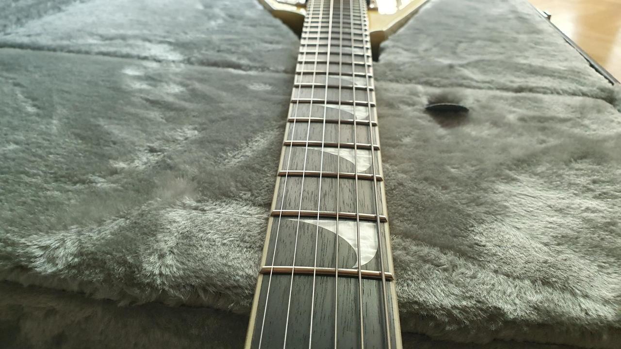 Tělo (křídla) z dnes málo viděného dřeva korina jako na starých Explorerech a Flying V - je úžasně lehká, pod 3,5 kg. PRŮBĚŽNÝ javorový krk (extra-thin U), menzura 648 mm. Hmatník eben makassar (rádius 350 mm, šířka nuláku 42 mm), 24 XJ pražců. Špičkový hardware: aktivní signature snímače EMG BoneBreaker (kobyla keramika, krk Alnico 5), kobylka TonePros (struny skrz tělo), zamykací mechaniky. Na metal je tenhle nástroj totální monstrum, díky krkovému snímači ale zvládá pěkně i čisté zvuky. Nástroj je téměř nehraný, bez jakékoli známky opotřebení - stav nového kusu (platí i pro kufr), dokonce ještě s fólií na pickguardu... Na Kytarách se prodává za 46 tis., nasazuju cenu o 12 tis. nižší, včetně kufru. Jen prodej, ne výměna. Osobní předání Praha (3).