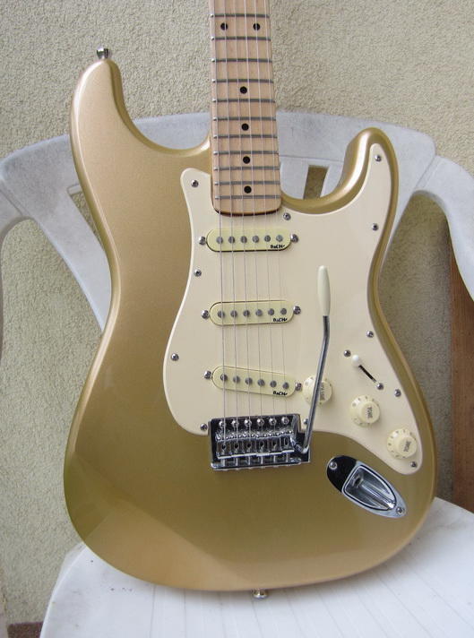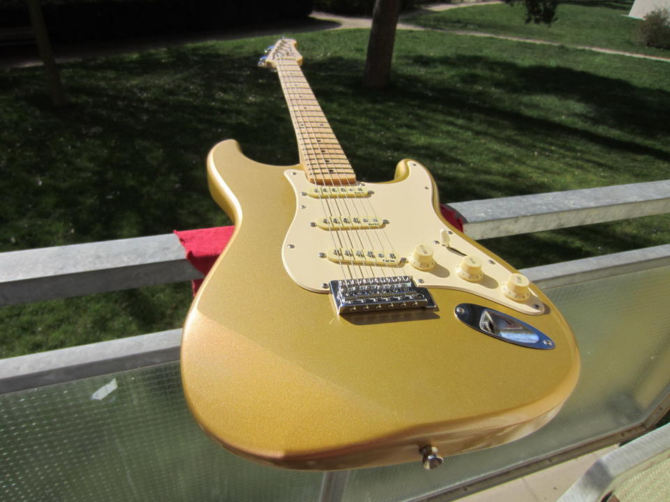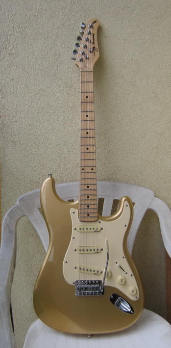 Prodám elektrickou kytaru Stratocaster JT-300 M SHG – kopie Fender s kvalitativními upgrady. Tělo kytary je z olše. Původní snímače vyměněny za značkové Alnico snímače Bach. Zadní strana krku je zbavena polyesterového laku a má saténový feel jako staré Fendery ze 60. let – příjemné na hraní. Mechaniky vyměněny za zcela nové značkové Gotoh. Vnitřek kytary je vystíněn měděnou fólií. Blok tremola je vyměněn za velký mosazný o plné tloušťce – delší sustain. Kytara je seřízena a osazena novými hybridními strunami Ernie Ball 9-46. Pražce jsou začištěny, kytara ladí a hraje bez problémů. Dvě menší odřeniny laku. Ve zlaté barvě už těžko sehnatelná.
