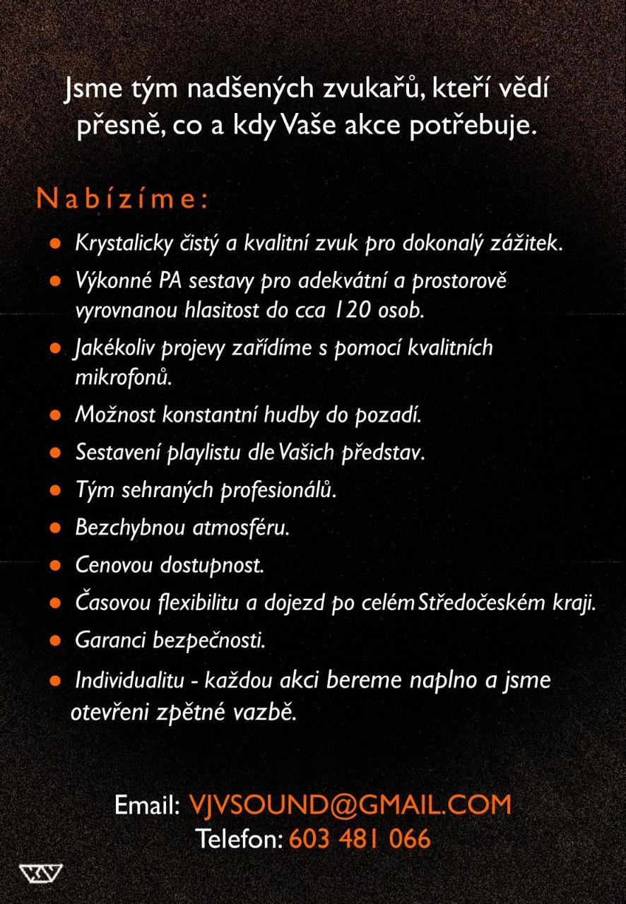 Klademe důraz na nadupaný zvuk a absolutní srozumitelnost zpěvů. Jsme tu pro kapely, obce a města, pořadatelé svateb a firemních večírků, který chtějí čistý vizuál bez hromady kabelů Jsme spolehliví, flexibilní a máme férové ceny, které se odvíjí od velikosti aparatury a délky akce. Nemusíte platit obří rentálku, když Vám stačí moderní a kompaktní řešení. Ozvěte se, rádi s Vámi probereme detaily Vaší akce nebo koncertu. Tým VJV Sound Vloženo 23.2.2026 14:43 pod č.742977